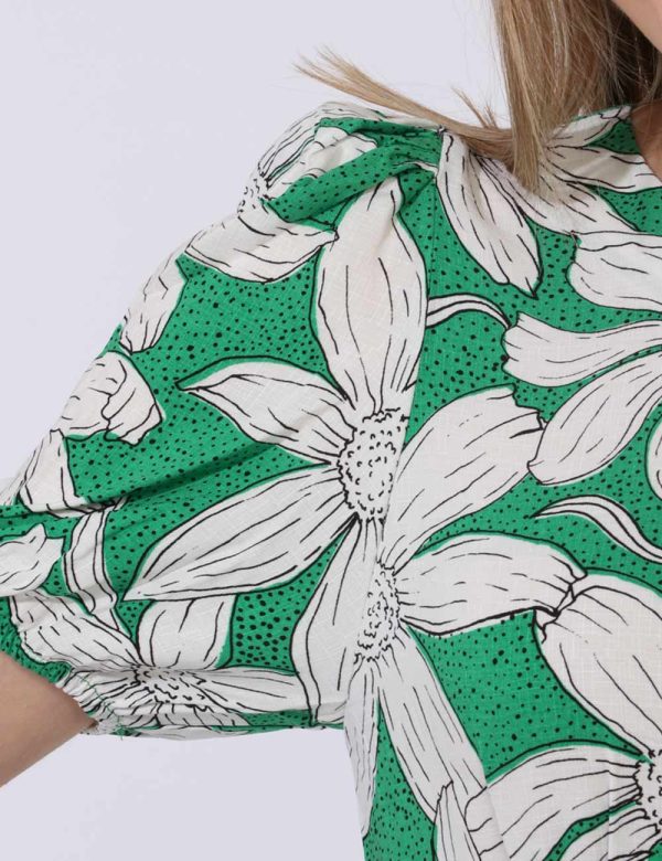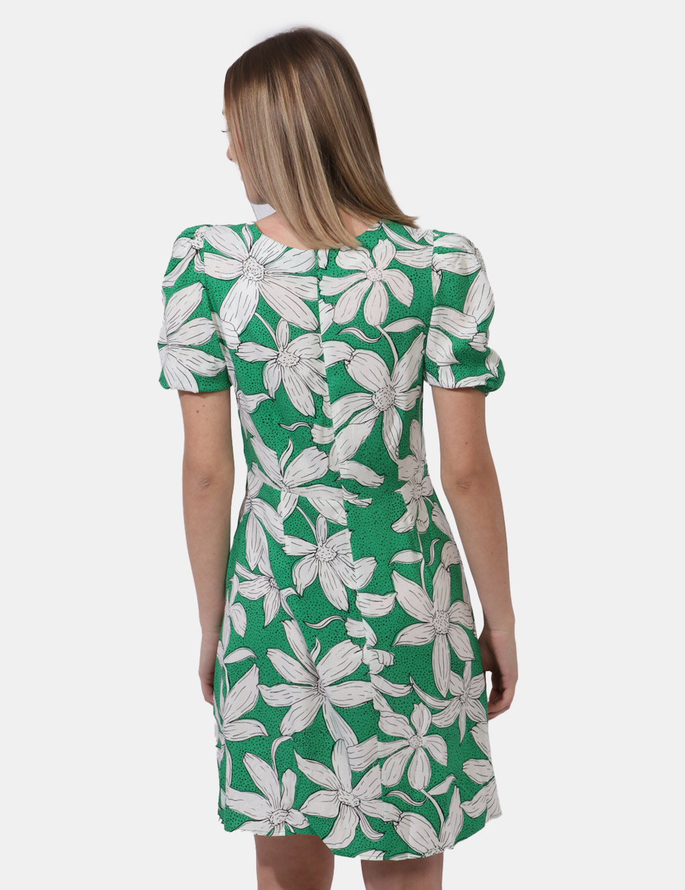 Vestito a maniche corte con gonna leggermente svasata e girocollo classico. Il capo si sviluppa su base verde foresta con stampa allover fiori bianchi. La vestibilità è morbida e pratica grazie a zip sul retro. L’abito è adatto per occasioni casual e facilmente combinabile con vari accessori. Dai un tocco di stile ai tuoi outfit.