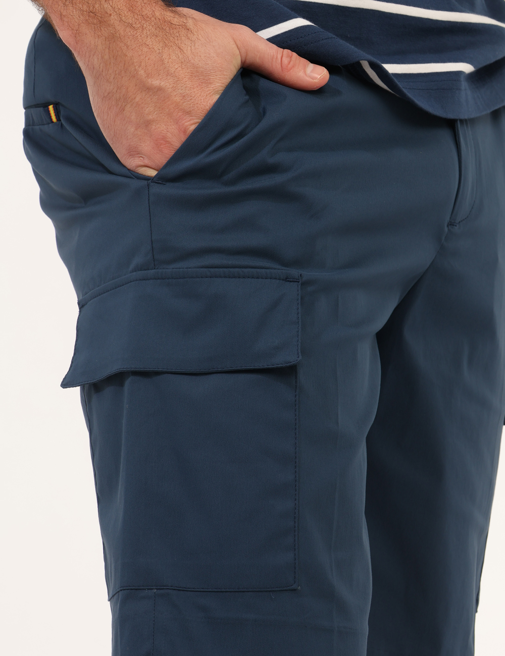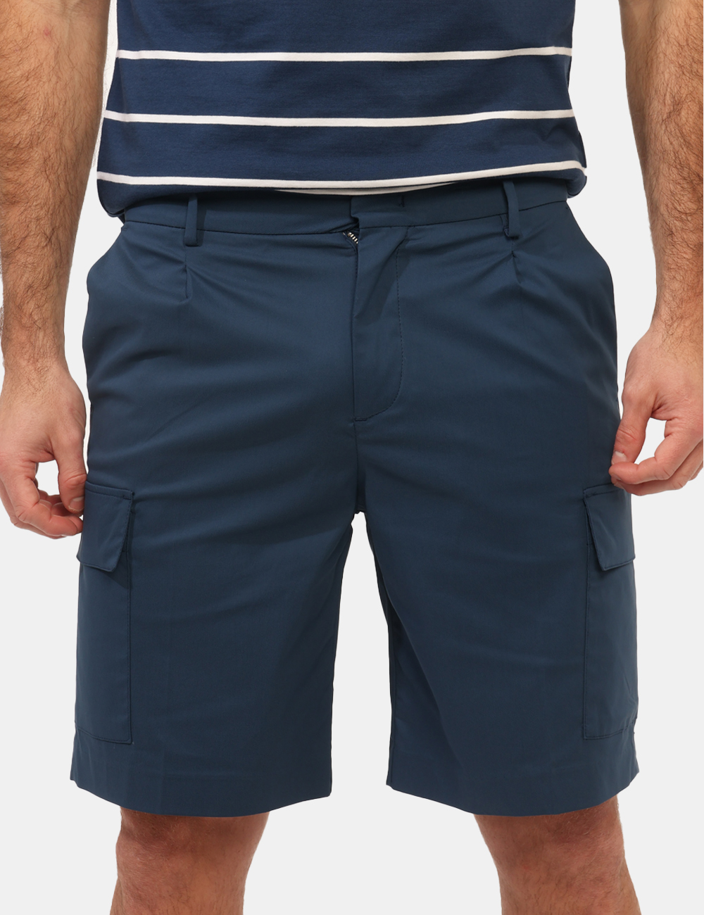 Il design si distingue per la costruzione pulita e funzionale: Bermuda con total blu, con tasche, gancino e zip, dettagli che donano struttura e praticità al capo. Le tasche rendono il modello perfetto per l’uso quotidiano, mentre la chiusura con gancino e zip assicura una linea ordinata e versatile.