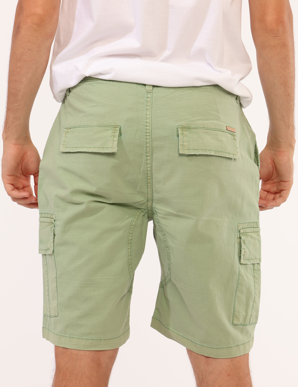 Bermuda classico in total verde chiaro con tasche a taglio trasversale sul fronte, tasche a fessura sul retro con linguetta. La vestibilità è morbida e pratica grazie a coulisse con cordino abbinato più bottone e zip. I bermuda sono adatti per occasioni casual e facilmente combinabili. Praticità e stile in un solo capo.