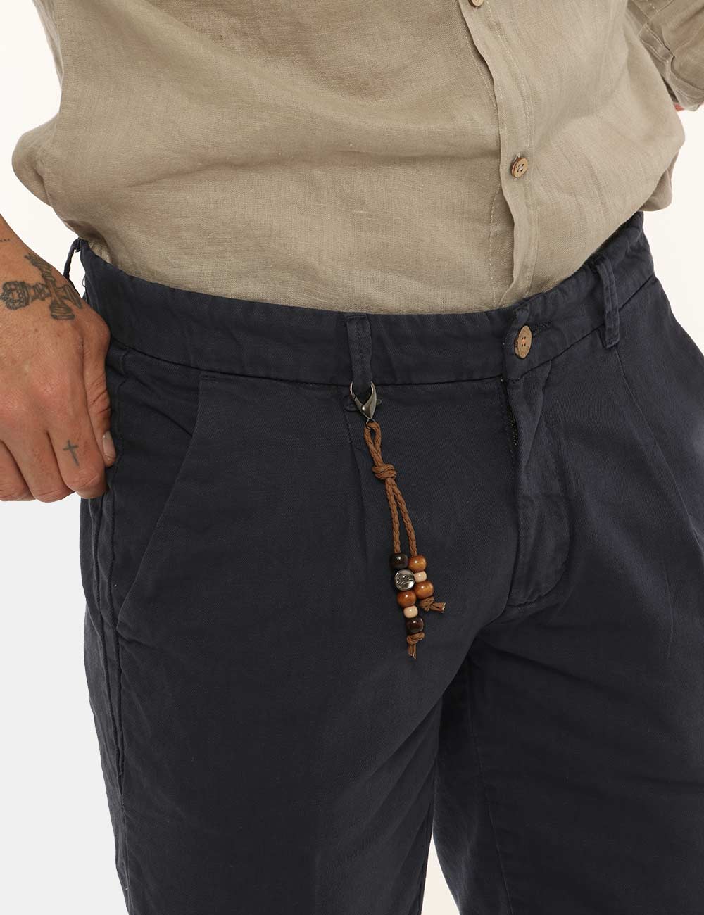 Bermuda in total blu notte con risvoltino. Presenti tasche a taglio trasversale più tasche a taglio sul retro. Ulteriore dettaglio è rappresentato da piccolo pendente in corda marrone. La vestibilità è morbida e pratica grazie a bottone ad asola più cerniera. Il bermuda è adatto per occasioni casual e facilmente combinabile per outfit diurni/serali. Indossalo peressere sempre a tuo agio.
