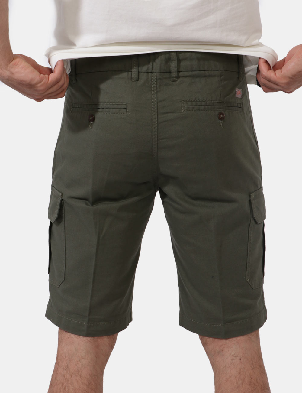 Bermuda in total verde militare con tasche a taglio trasversale sul fronte. Presenti tasche a taglio sul retro, tasche a toppa laterali, più pendente in tonalità marrone. La vestibilità è morbida e pratica grazie a bottone ad asola più zip, ma anche regolabile grazie a coulisse e laccetto in tinta. I pantaloni sono adatti per occasioni casual e facilmente combinabili. Praticitè e stile in un solo capo.