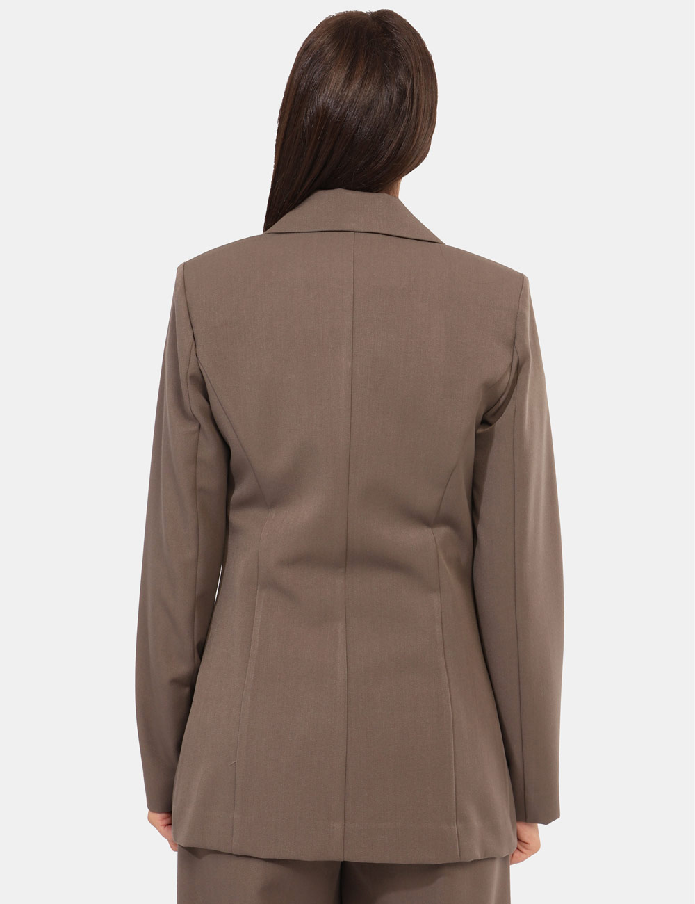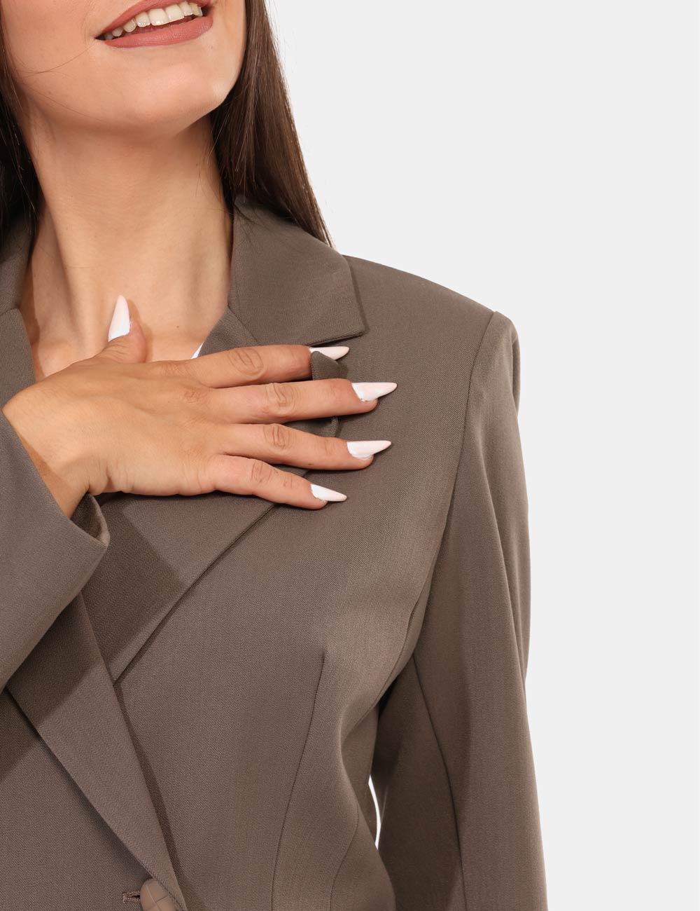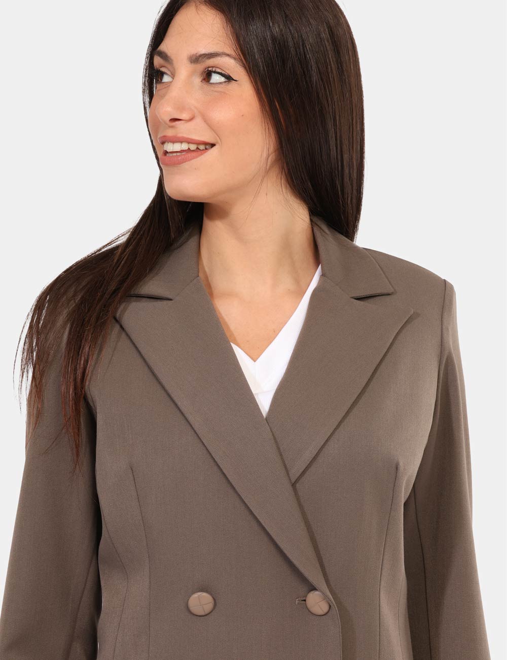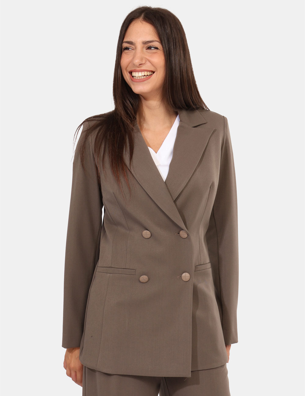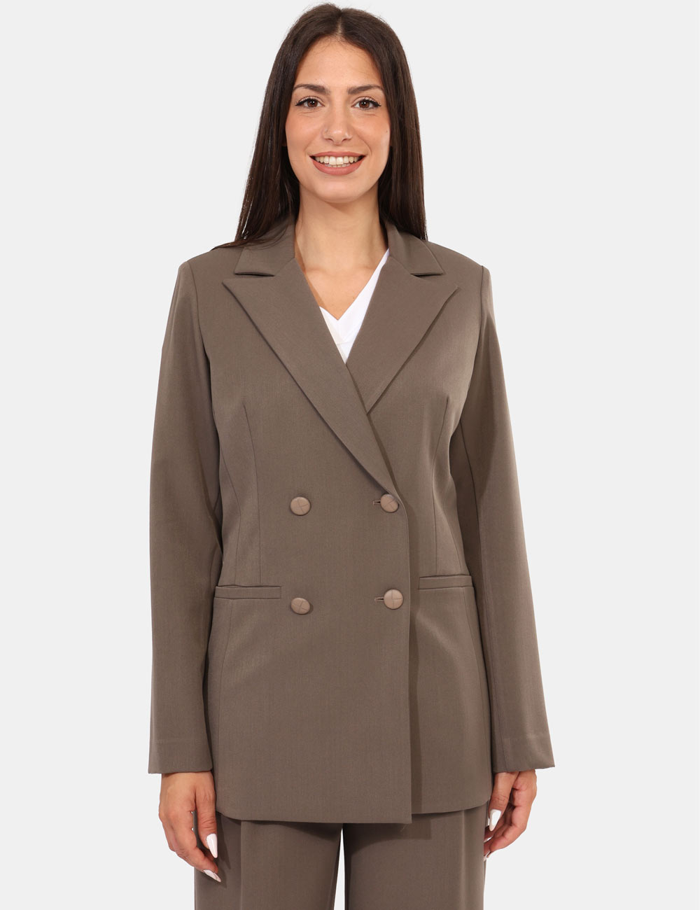 Blazer classico, in total grigio tortora, con tasche fake e chiusura in doppio petto con bottoni ad asola in tinta. La vestibilità è morbida e regolare. Il blazer è adatto per occasioni casual/raffinate, perfettamente combinabile con il pantalone abbinato per dar vita ad un tailleur perfetto. Indossalo per essere impeccabile.