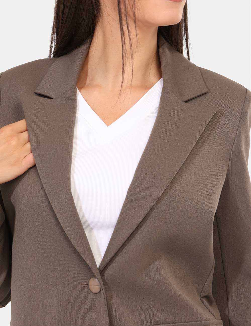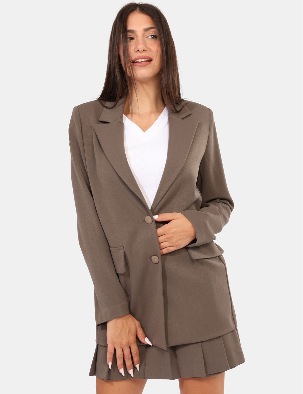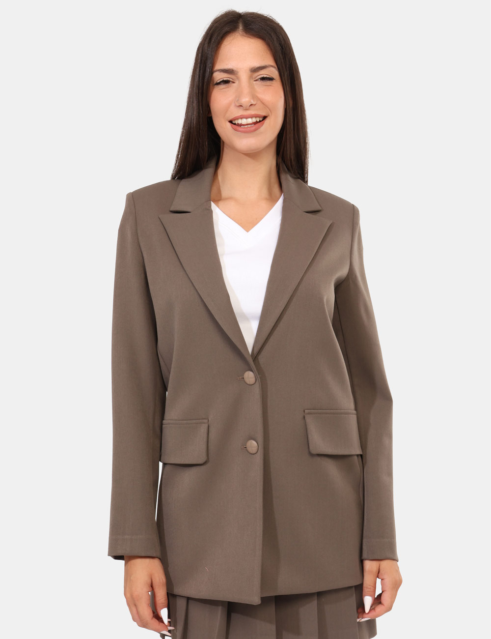 Blazer classico, in total grigio tortora, con tasche fake e doppio bottone ad asola in tinta. La vestibilità è morbida e regolare. Il blazer è adatto per occasioni casual/raffinate, perfettamente combinabile con il pantalone abbinato per dar vita ad un tailleur perfetto. Indossalo per essere impeccabile.