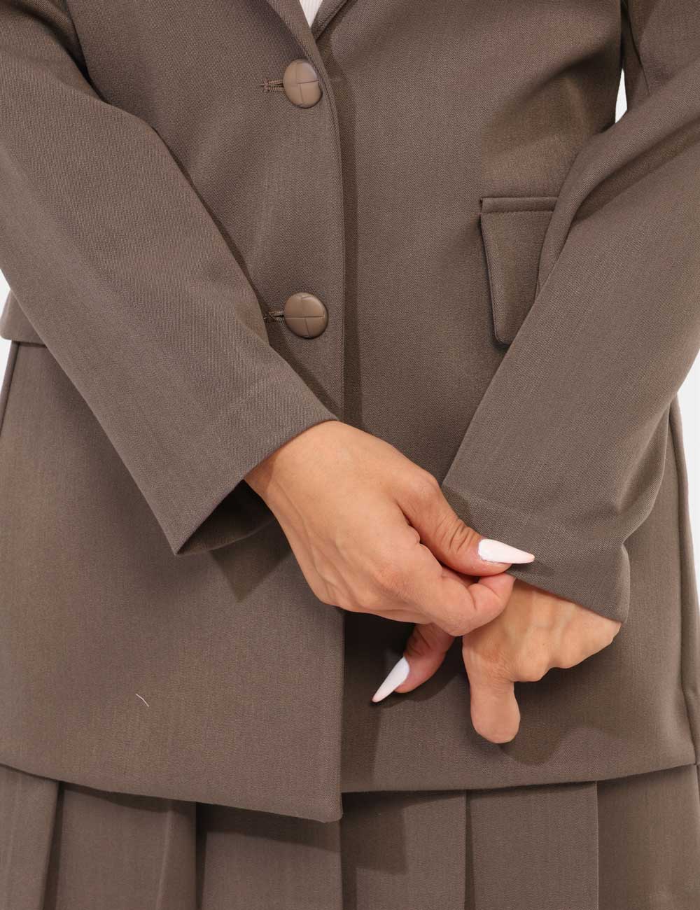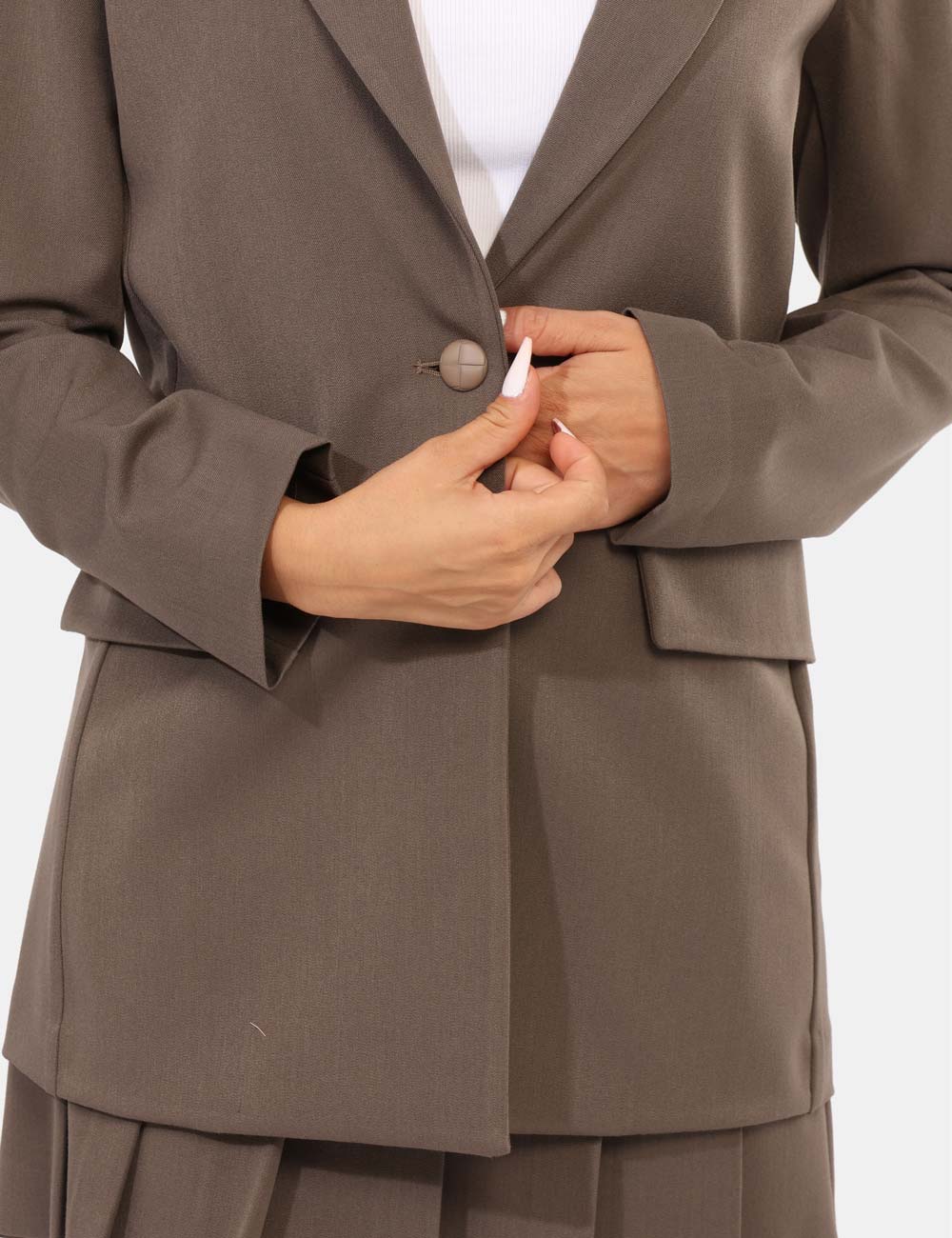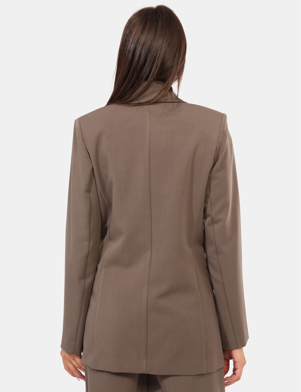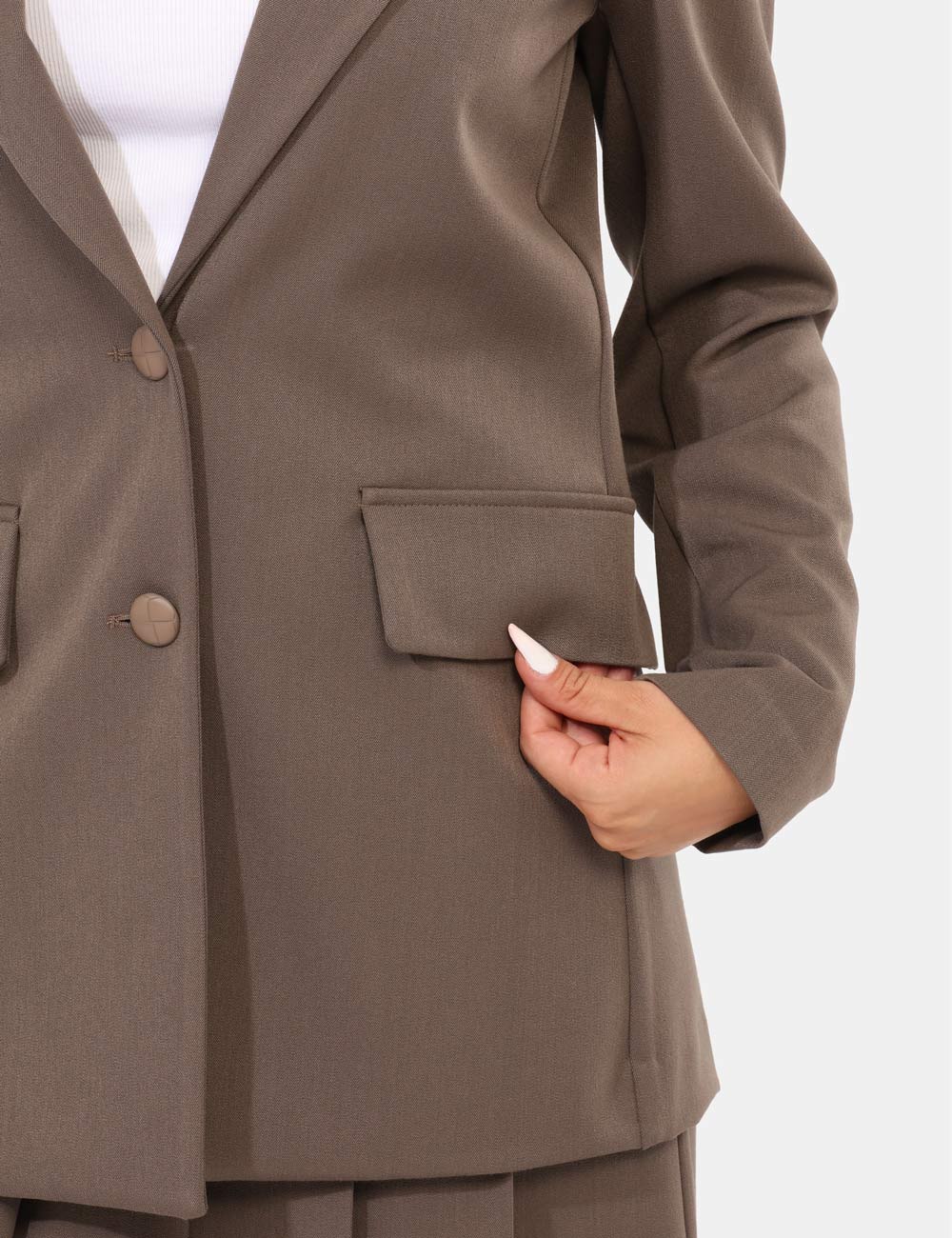 Blazer classico, in total grigio tortora, con tasche fake e doppio bottone ad asola in tinta. La vestibilità è morbida e regolare. Il blazer è adatto per occasioni casual/raffinate, perfettamente combinabile con il pantalone abbinato per dar vita ad un tailleur perfetto. Indossalo per essere impeccabile.