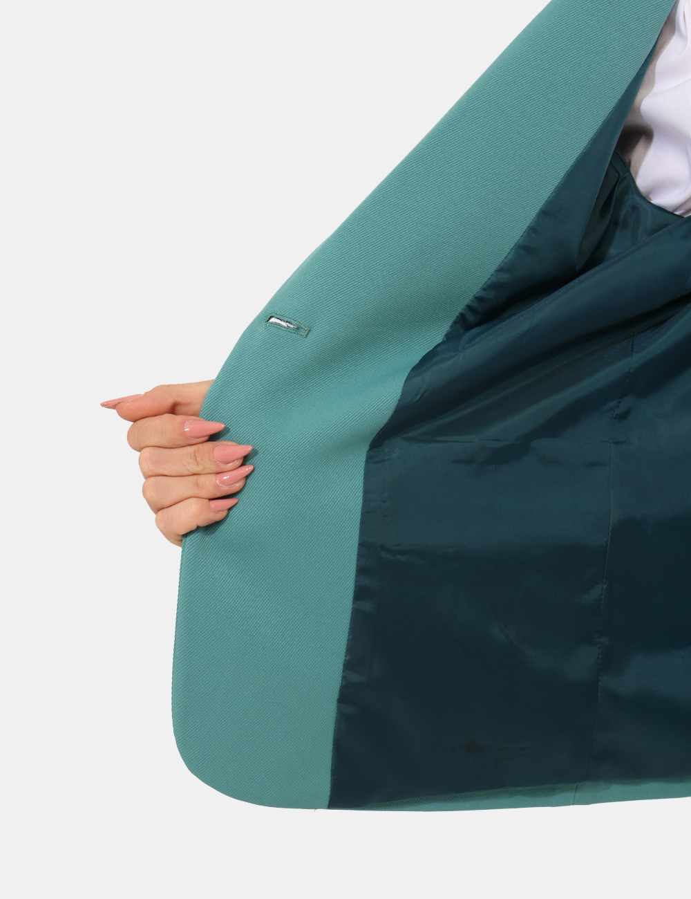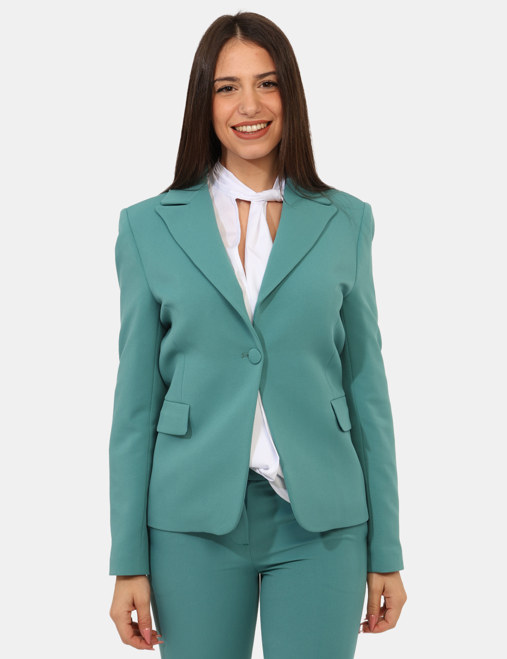 Blazer classico, in total verde tiffany, con tasche fake ed unico bottone ad asola in tinta. La vestibilità è morbida e regolare. Il blazer è adatto per occasioni casual/raffinate, perfettamente combinabile con il pantalone abbinato per dar vita ad un tailleur perfetto. Indossalo per essere impeccabile.