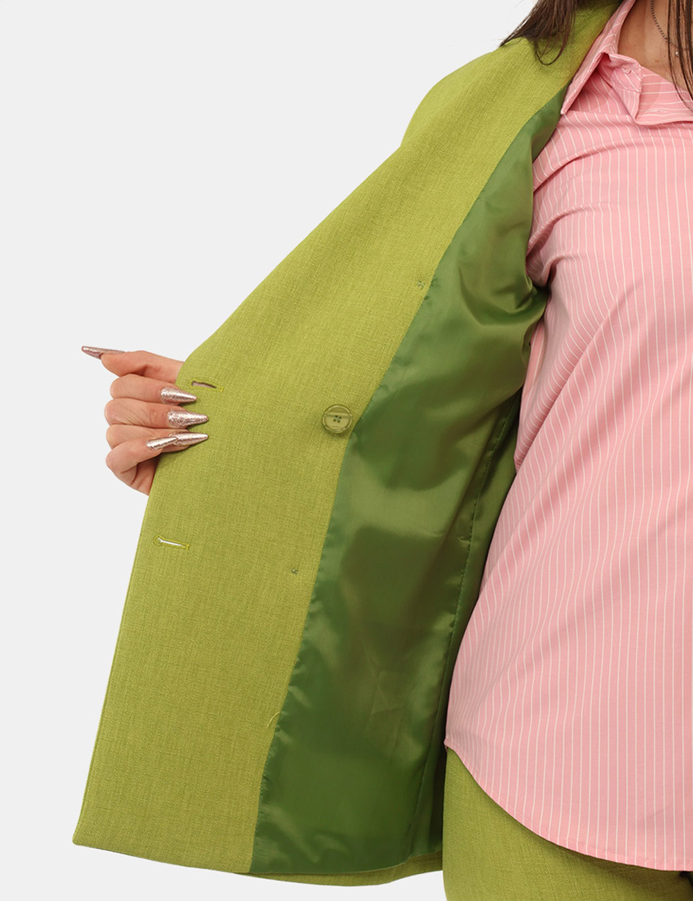 Per un outfit coordinato ed elegante, puoi abbinarlo a pantaloni nello stesso colore e un top neutro; per uno stile più dinamico e contemporaneo, indossalo con jeans e sneakers. Il verde, intenso e raffinato, è una tonalità che trasmette equilibrio e freschezza, perfetta per la stagione.