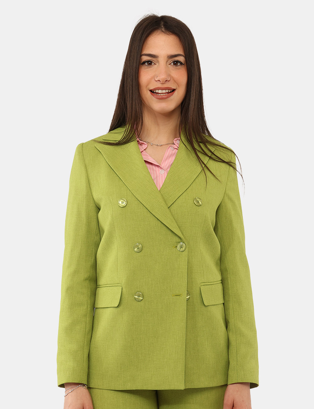 Il Blazer MATERICA Verde è il capo perfetto per chi desidera distinguersi con eleganza e personalità. Realizzato in 100% poliestere, è leggero, pratico e ideale per accompagnarti durante tutta la giornata con comfort e stile. Il design con doppia petto, bottoni ad asola, tasche fake dona struttura al capo e richiama un’estetica sartoriale contemporanea, valorizzando la figura grazie alla vestibilità regolare.