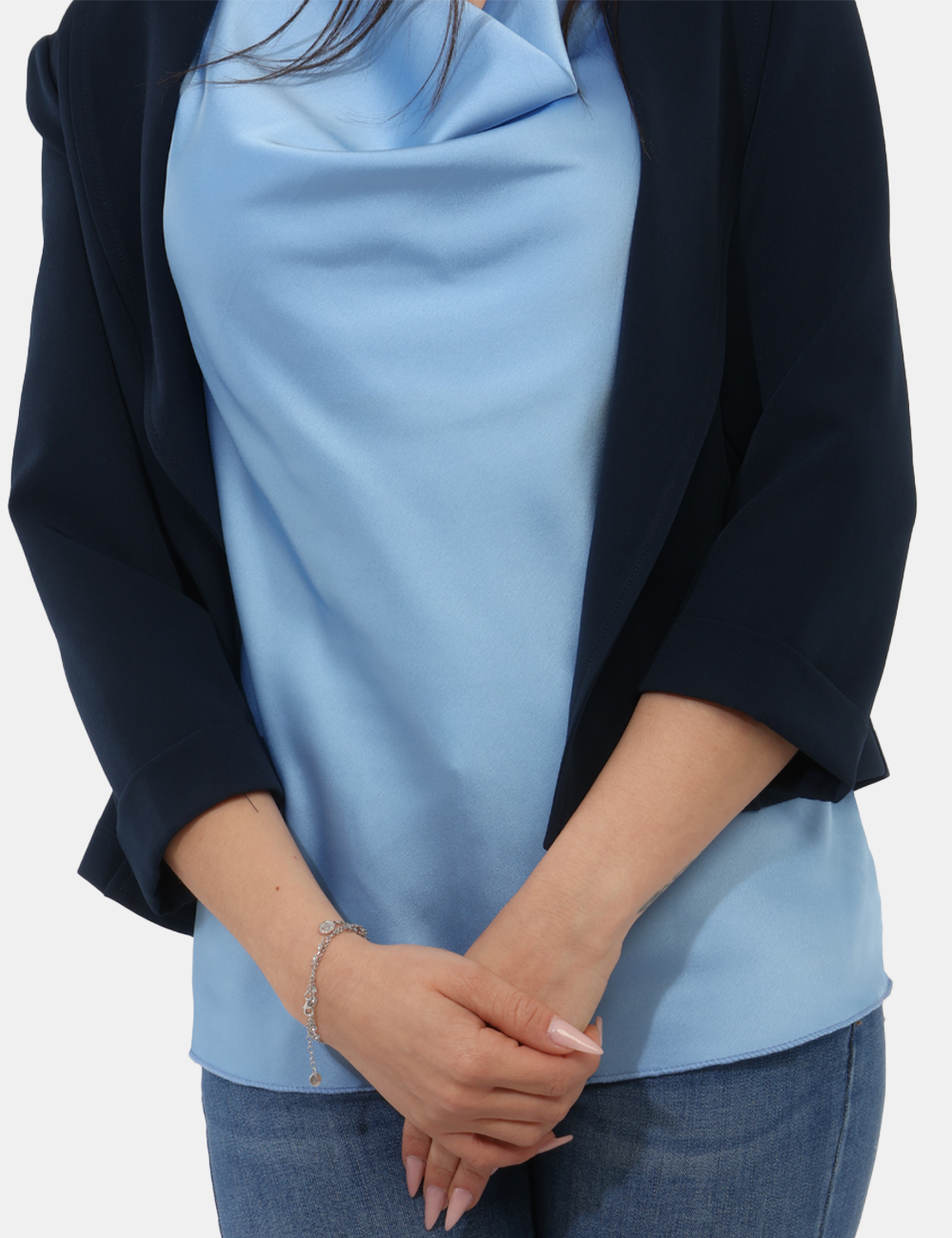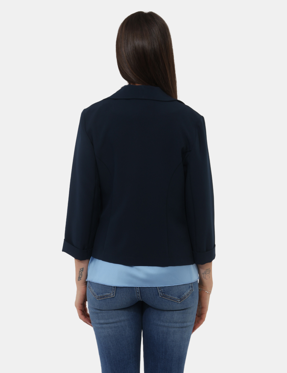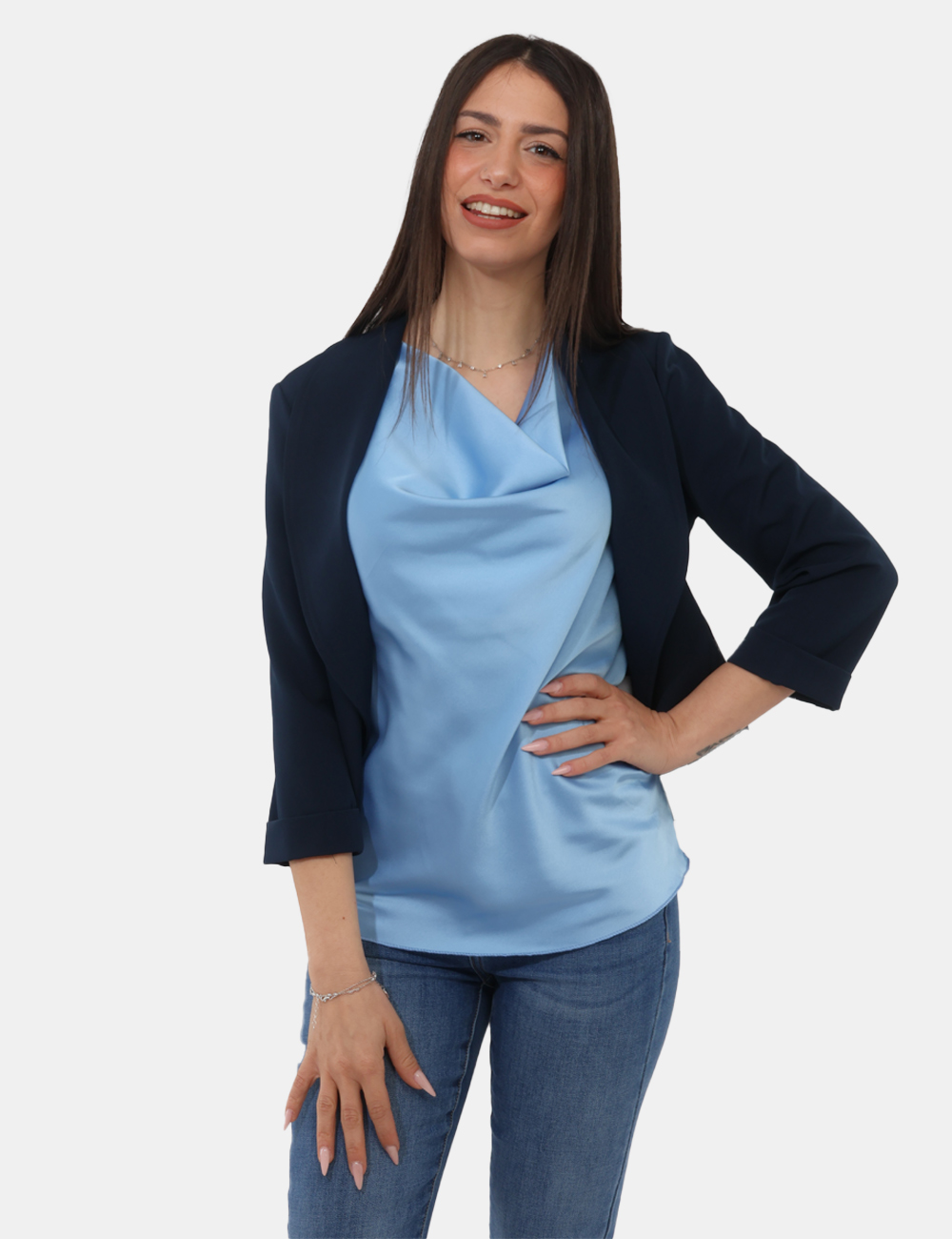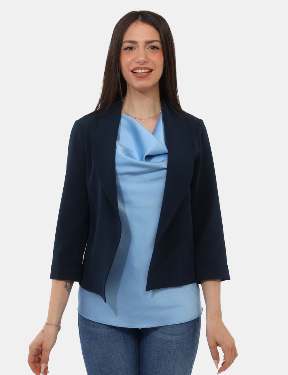 Realizzato in un tessuto elasticizzato (88% poliestere, 12% elastina), offre comfort e libertà di movimento, adattandosi con naturalezza alla silhouette. Il design è caratterizzato da dettagli raffinati come la manica 3/4 e il collo a scialle, mentre l’assenza di allacciatura dona un aspetto fluido e contemporaneo. Questo blazer con manica 3/4, collo a scialle , senza allaciatura è pensato per essere pratico ma allo stesso tempo ricercato. La vestibilità è regolare: la modella è alta 165 cm e indossa una taglia S.