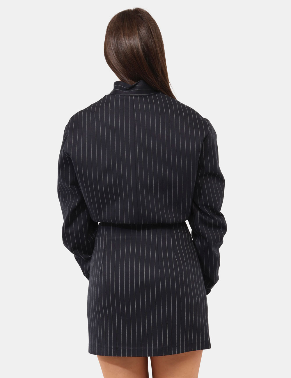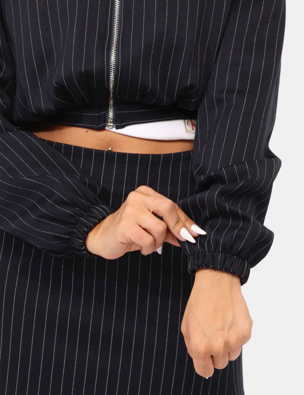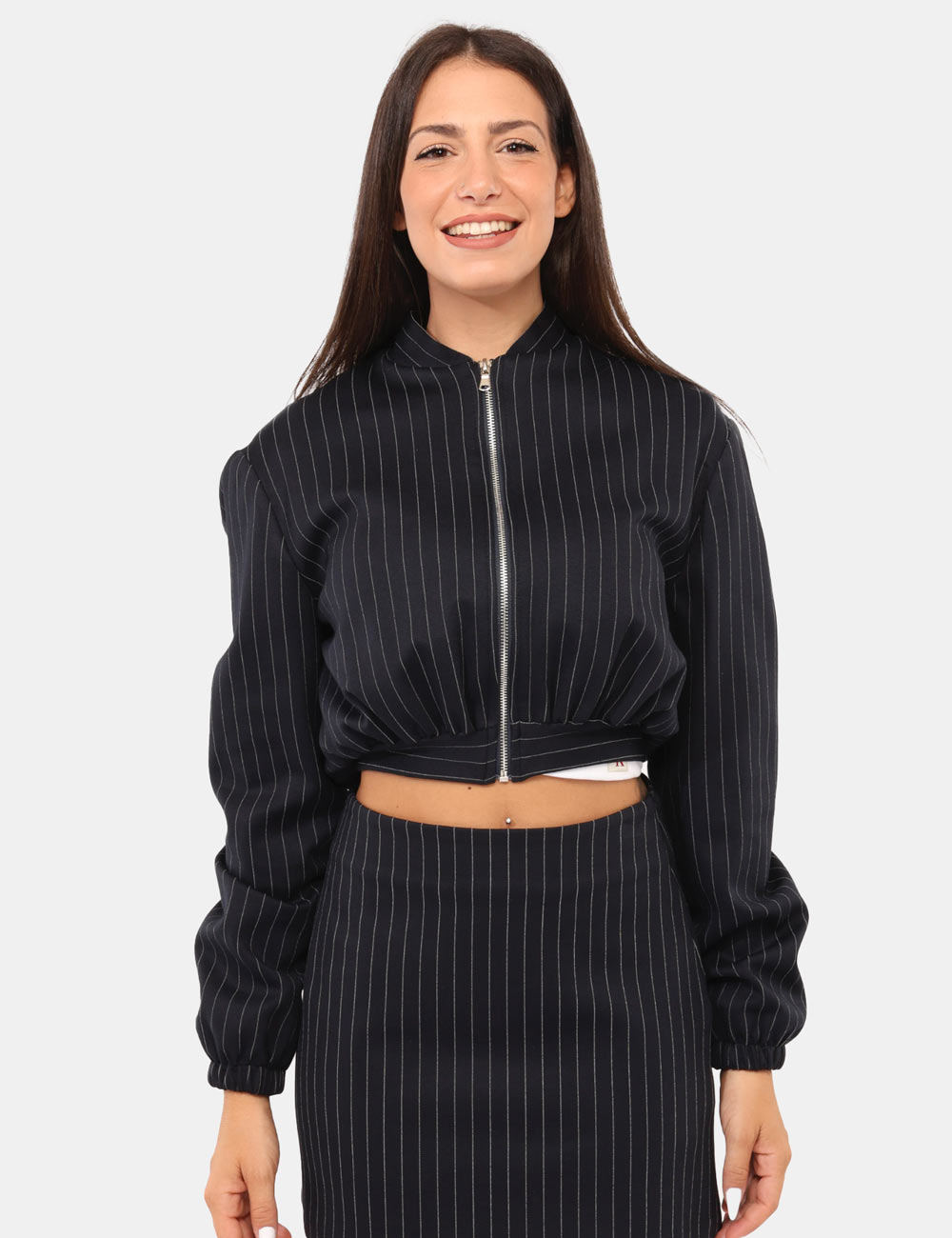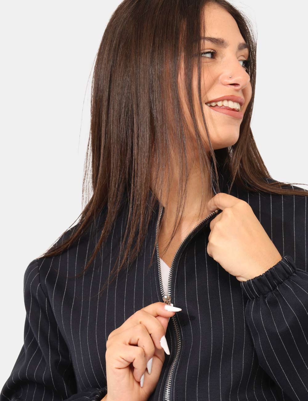 Blazer corto, gessato, in blu scuro e bianco. La vestibilità del capo è morbida e pratica grazie a zip sul fronte. Il blazer è adatto per occasioni casual/raffinate e ideale con la gonna coordinata, per dar vita ad un tailleur perfetto. Dona un tocco di stile ai tuoi outfit.