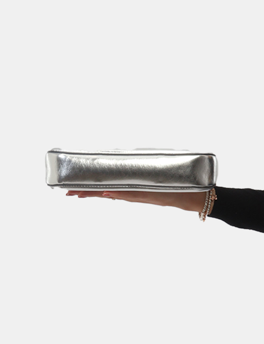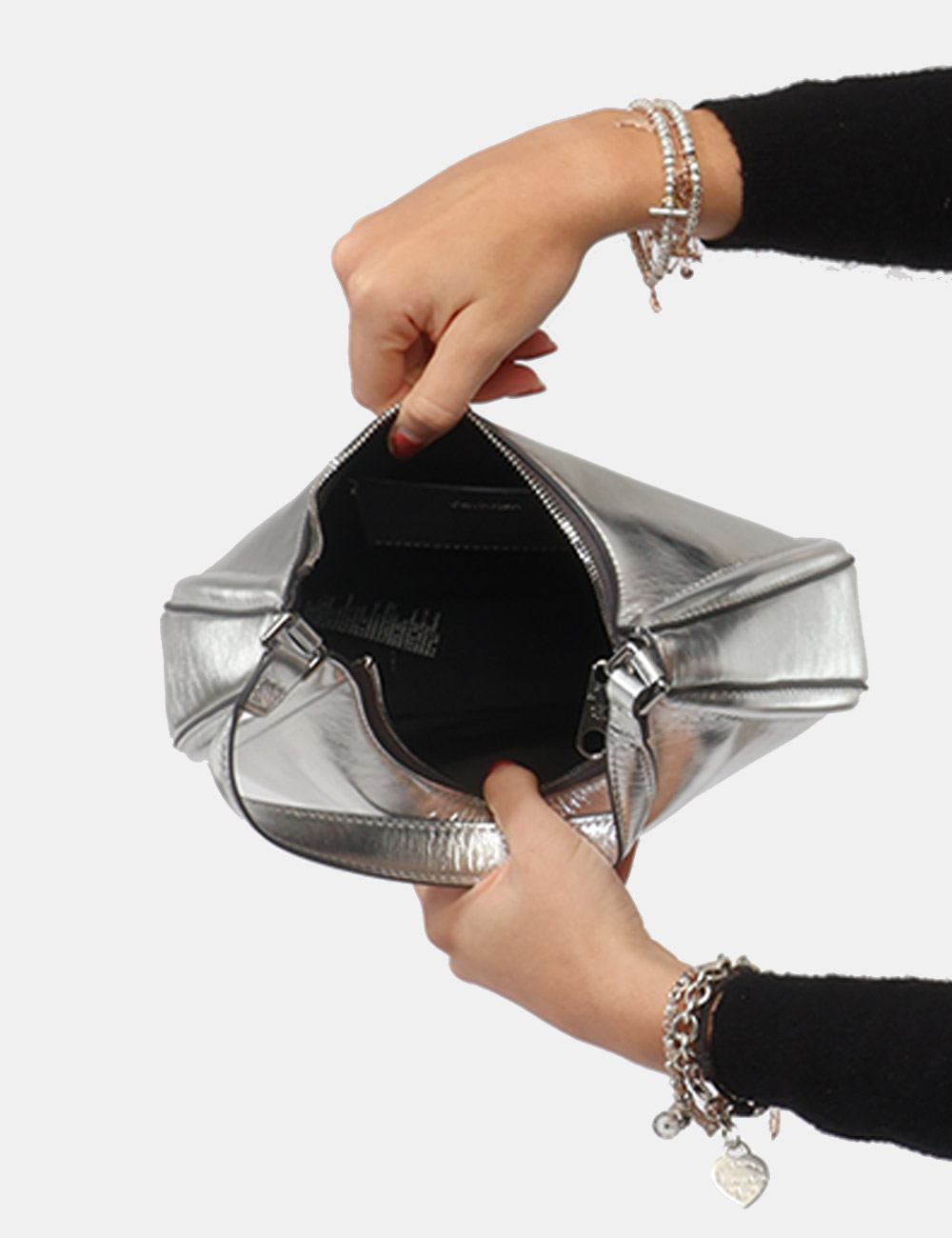 Il colore argento, brillante e contemporaneo, illumina ogni outfit e aggiunge un accento fashion e deciso, rendendo questa borsa un accessorio protagonista del tuo guardaroba.