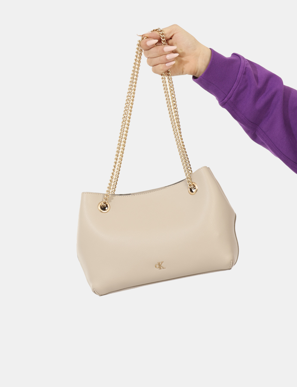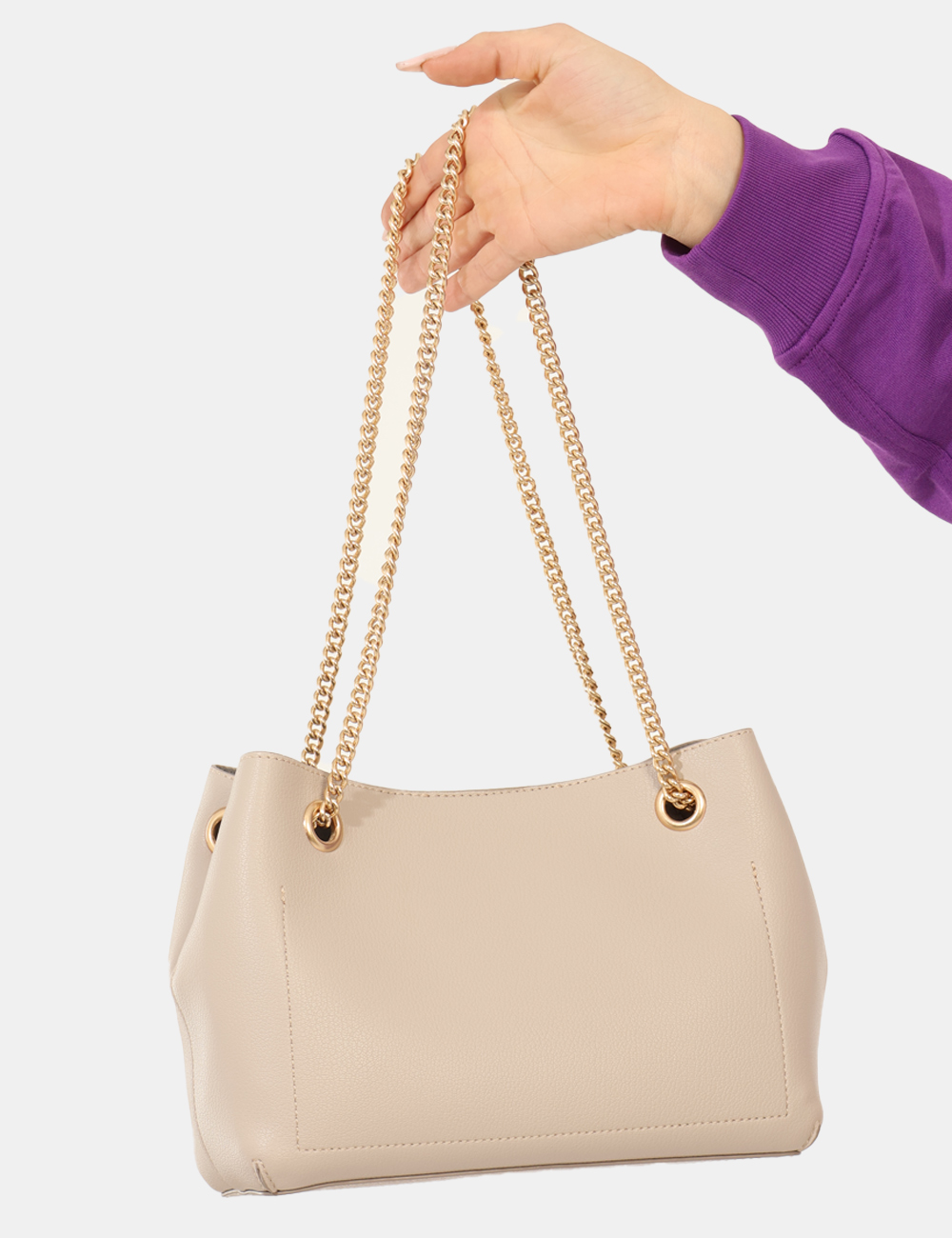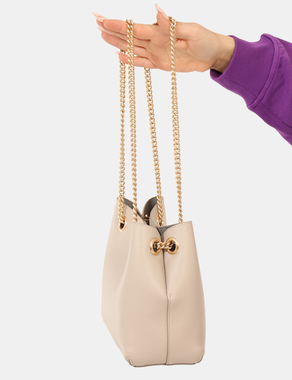Borsa di medie dimensioni, modello secchiello, in total beige con unico scompartimento e chiusura a calamita più taschine interne. L’indossatura è pratica e maneggevole grazie a manico a catenella dorata, perfettamente coordinato ai dettagli. La borsa è adatta per occasioni casual/raffinate, ideale anche per l’ufficio. Completa la tua collezione.