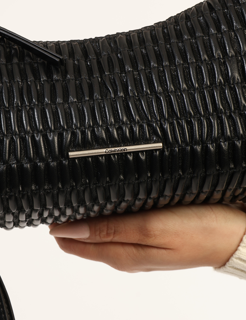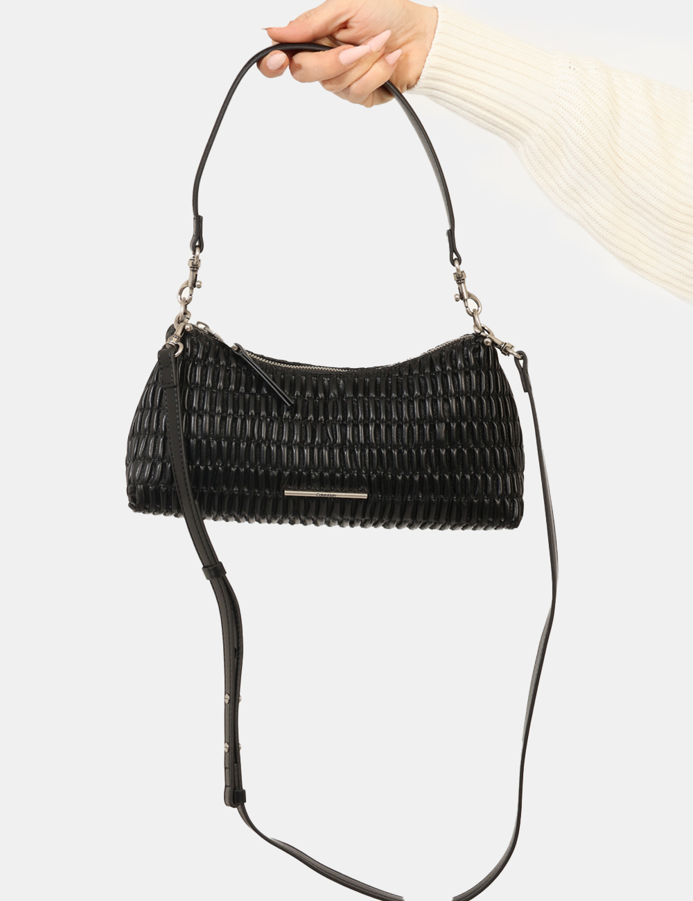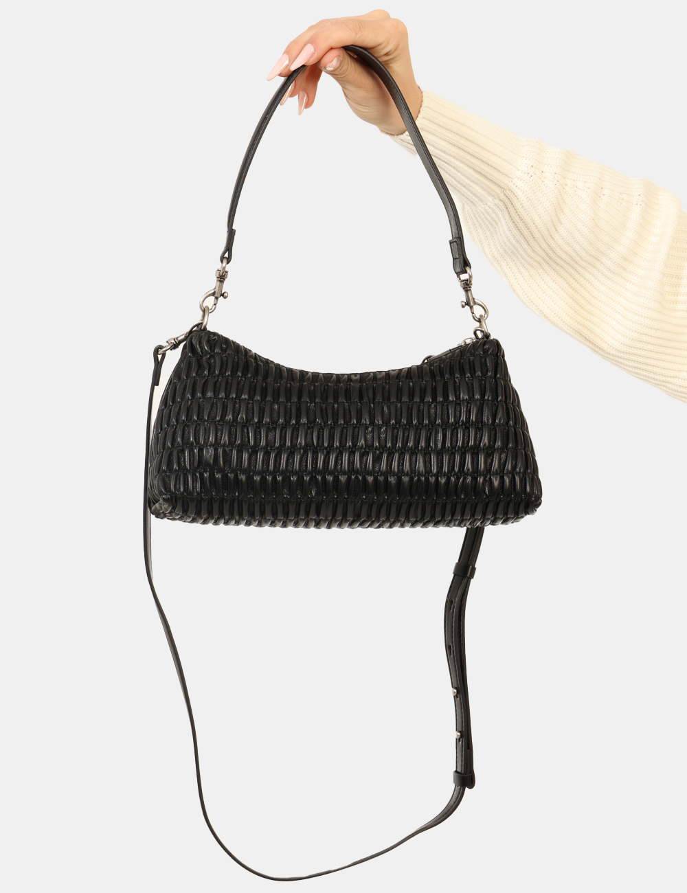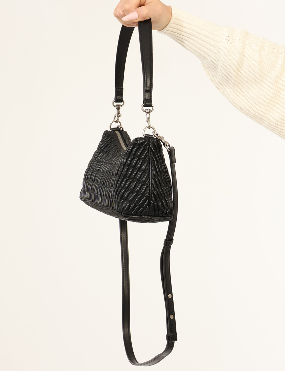 Borsa di medie dimensioni in total nero con tessuto raggrinzito. La borsa è composta da unico scompartimento con chiusura a zip. L’indossatura è pratica e maneggevole grazie a manico più tracolla sottile in tinta regolabile. La borsa è adatta per occasioni casual. L’accessorio su misura per te.