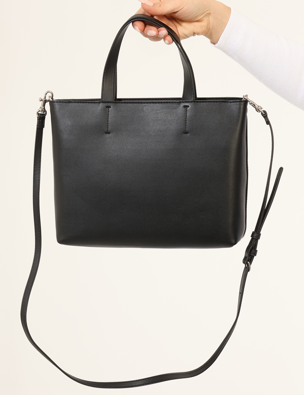 Borsa di medie dimensioni in total nero con logo brand in rilievo. La borsa è composta da unico scompartimento con chiusura a zip più taschine interne. L’indossatura è pratica e maneggevole grazie a doppio manico più tracolla sottile in tinta regolabile. La borsa è adatta per occasioni casual e per il giorno. L’accessorio su misura per te.