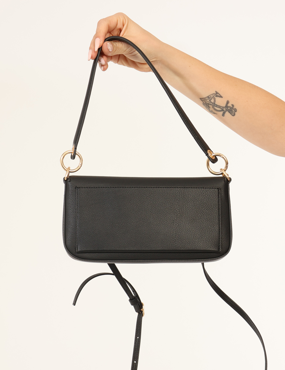 Borsa modello pochette in total nero, con logo brand in metallo dorato e chiusura con bottone automatico. L’indossatura è pratica e maneggevole grazie a tracolla sottile in tinta. La pochette è adatta per occasioni casual/raffinate. L’accessorio su misura per te.