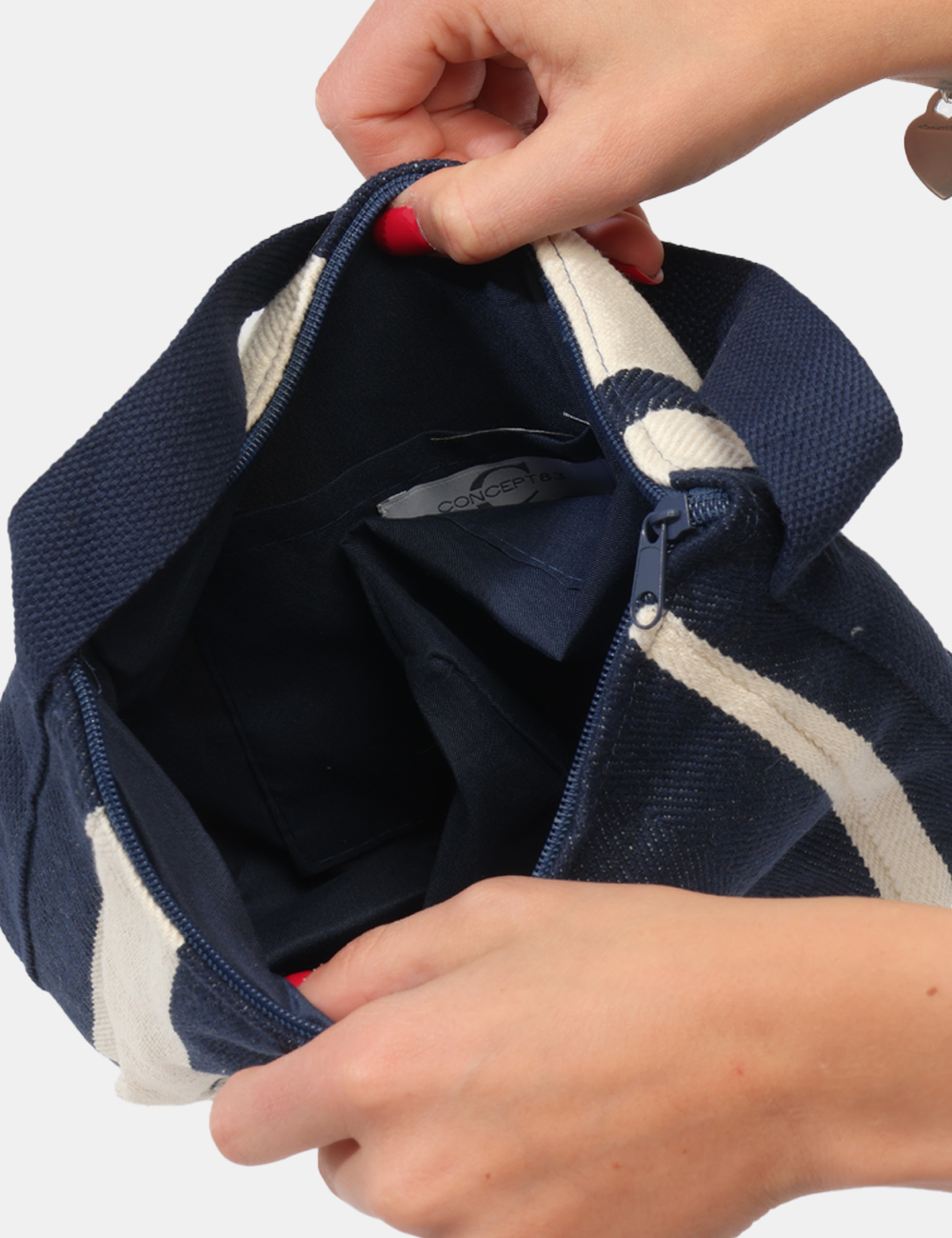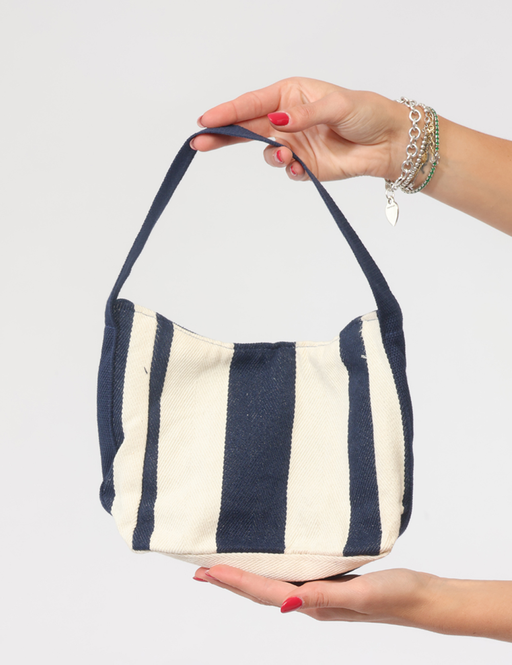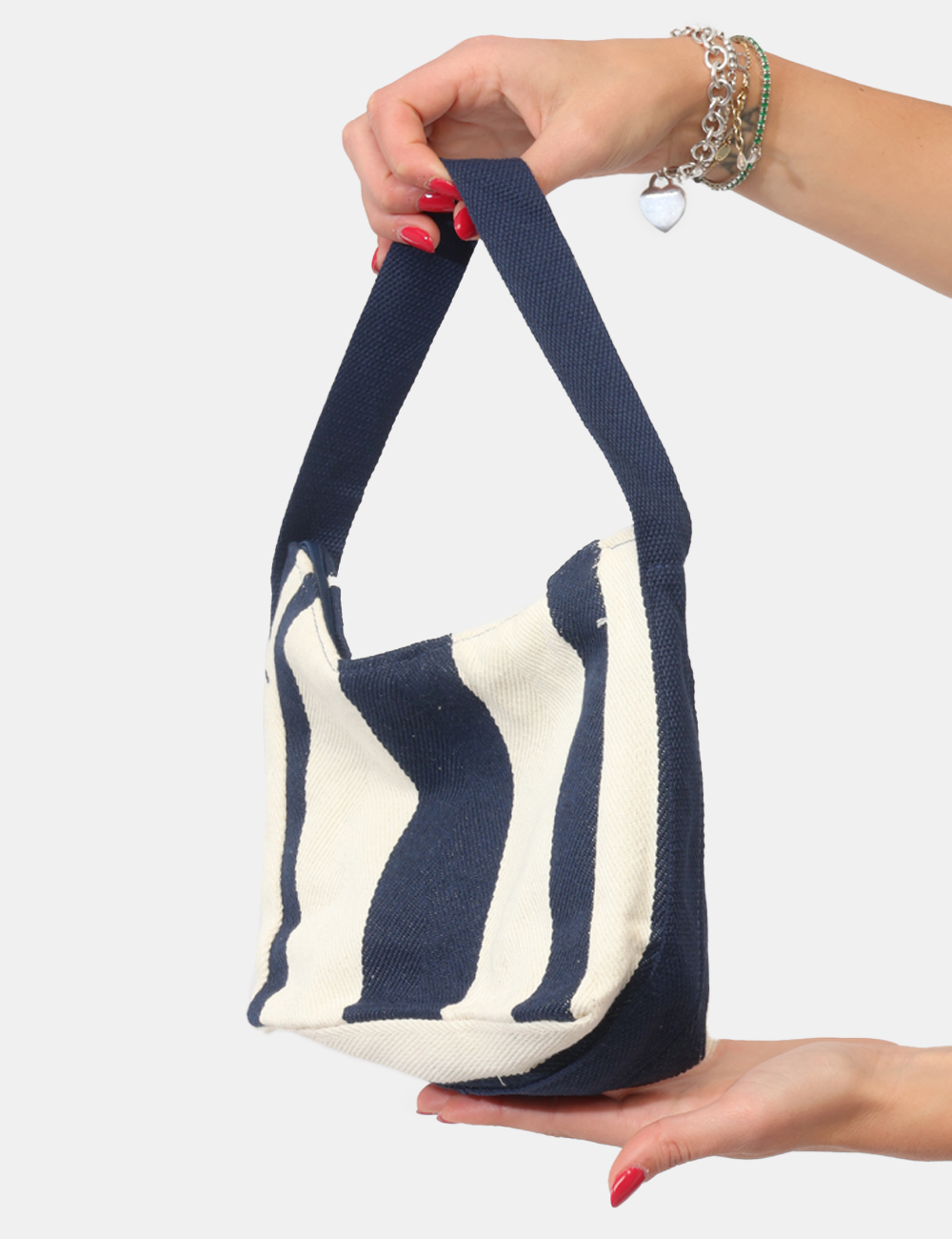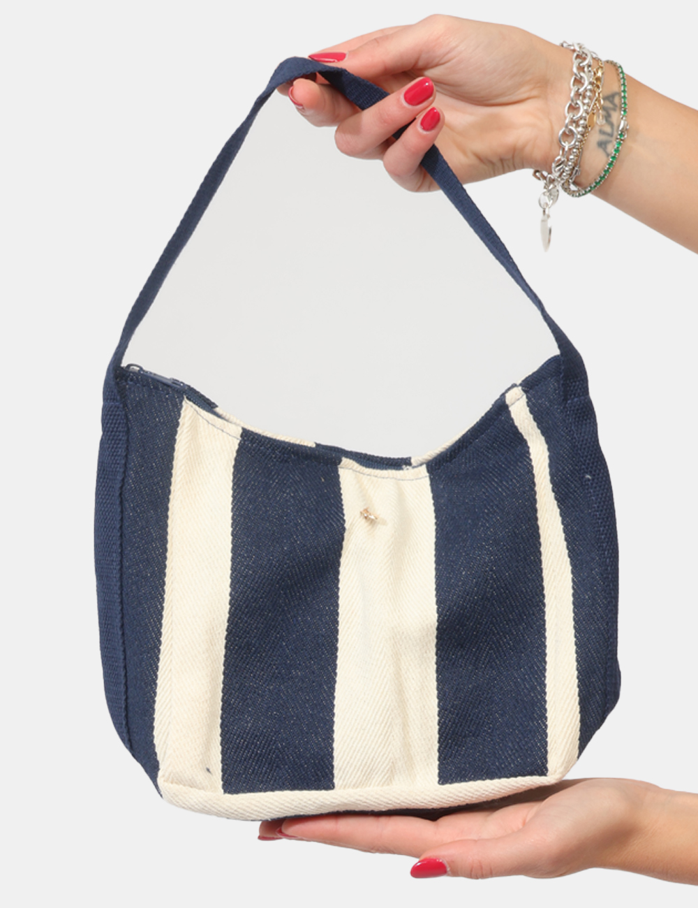 Realizzata in 70% poliestere e 30% cotone, è una borsa con righe bianche e blu che unisce resistenza e leggerezza, ideale per un utilizzo quotidiano. Il suo stile versatile ti permette di abbinarla facilmente a jeans e t-shirt per un look casual e rilassato, oppure a un abito leggero per un outfit più femminile e curato.