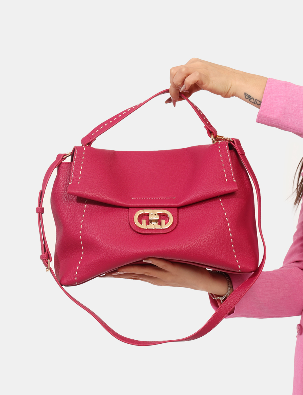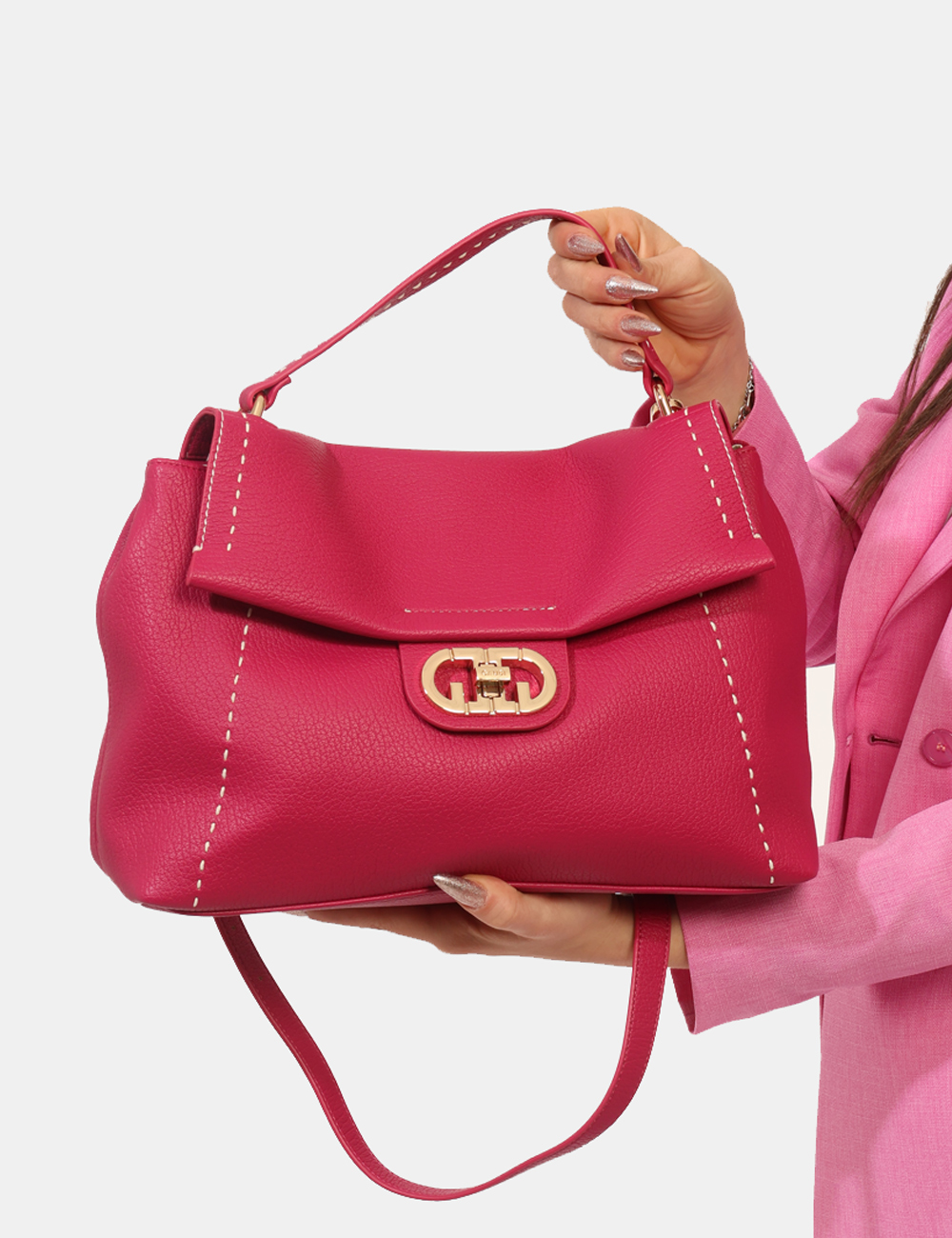 La Borsa GAUDI Fuxia è l’accessorio perfetto per chi ama osare con stile e aggiungere un tocco vivace ai propri outfit. Questa borsa da donna adatta alla stagione primavera estate si distingue per la tonalità fuxia intensa e luminosa, ideale per dare personalità anche ai look più semplici. Capiente e ben strutturata, è pensata per accompagnarti con eleganza nelle giornate più dinamiche. Realizzata in 100% poliuretano, offre una combinazione di leggerezza e resistenza, perfetta per l’utilizzo quotidiano. La Borsa con chiusura con gancino, tasche interne, manico e tracolla regolabile garantisce praticità e versatilità: le tasche interne permettono di organizzare al meglio gli oggetti personali, mentre il manico e la tracolla regolabile consentono di indossarla a mano o a spalla, adattandola alle tue esigenze. Le misure taglia U sono: base inferiore 35 cm, altezza massima 25 cm, profondità 11 cm. Si tratta di un pezzo unico di campionario, dettaglio che la rende ancora più esclusiva. Perfetta nel tempo libero di giorno con jeans e sneakers per un look fresco e contemporaneo, oppure di sera con un abito nero o un completo elegante per un contrasto deciso e femminile. Un accessorio di carattere, pensato per valorizzare il tuo stile nella stagione primavera estate. Tutti i prodotti su SecondaStrada.com sono originali. Codice articolo V6AE 12871 MA CB.