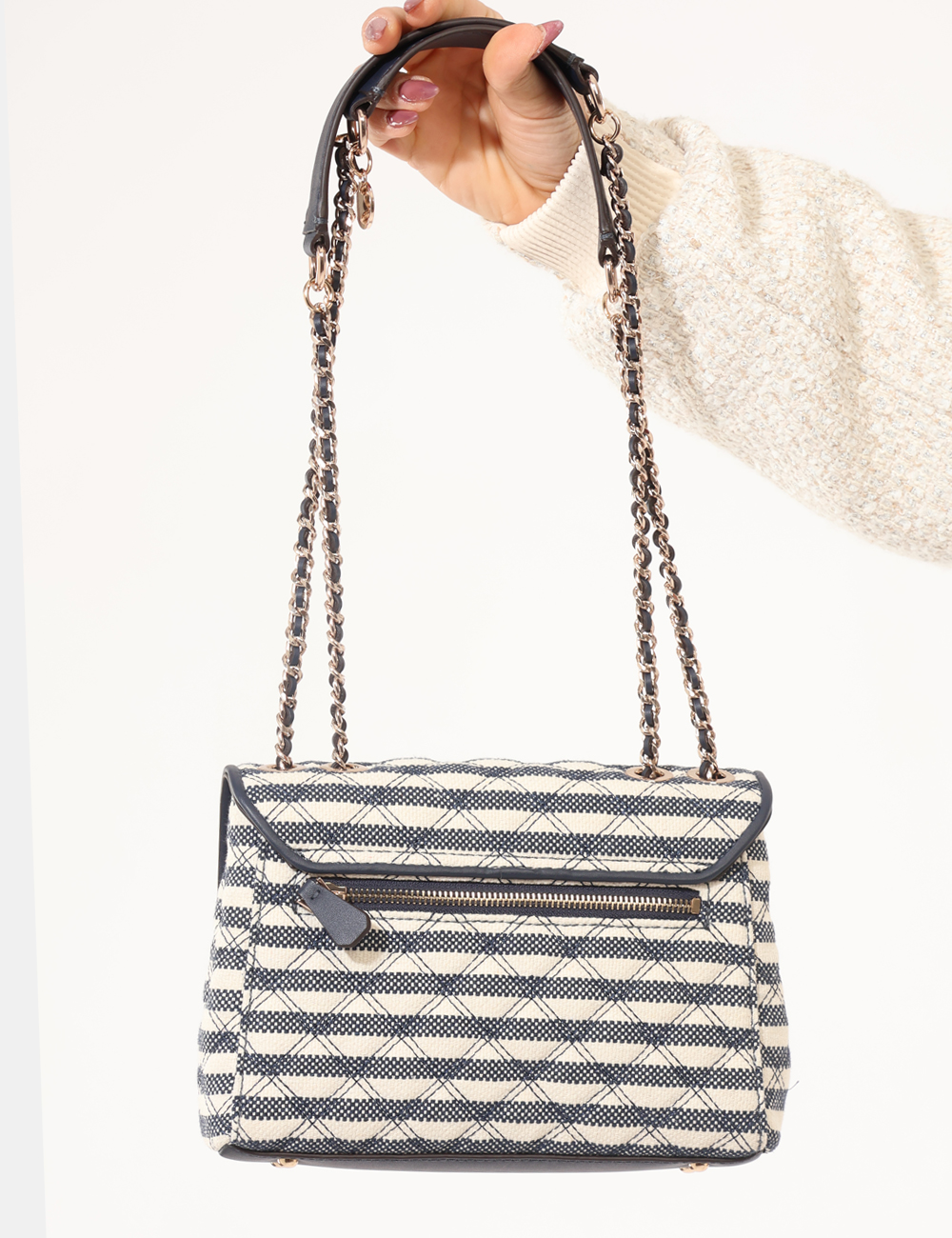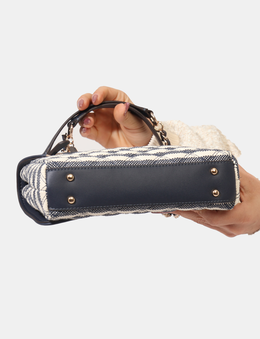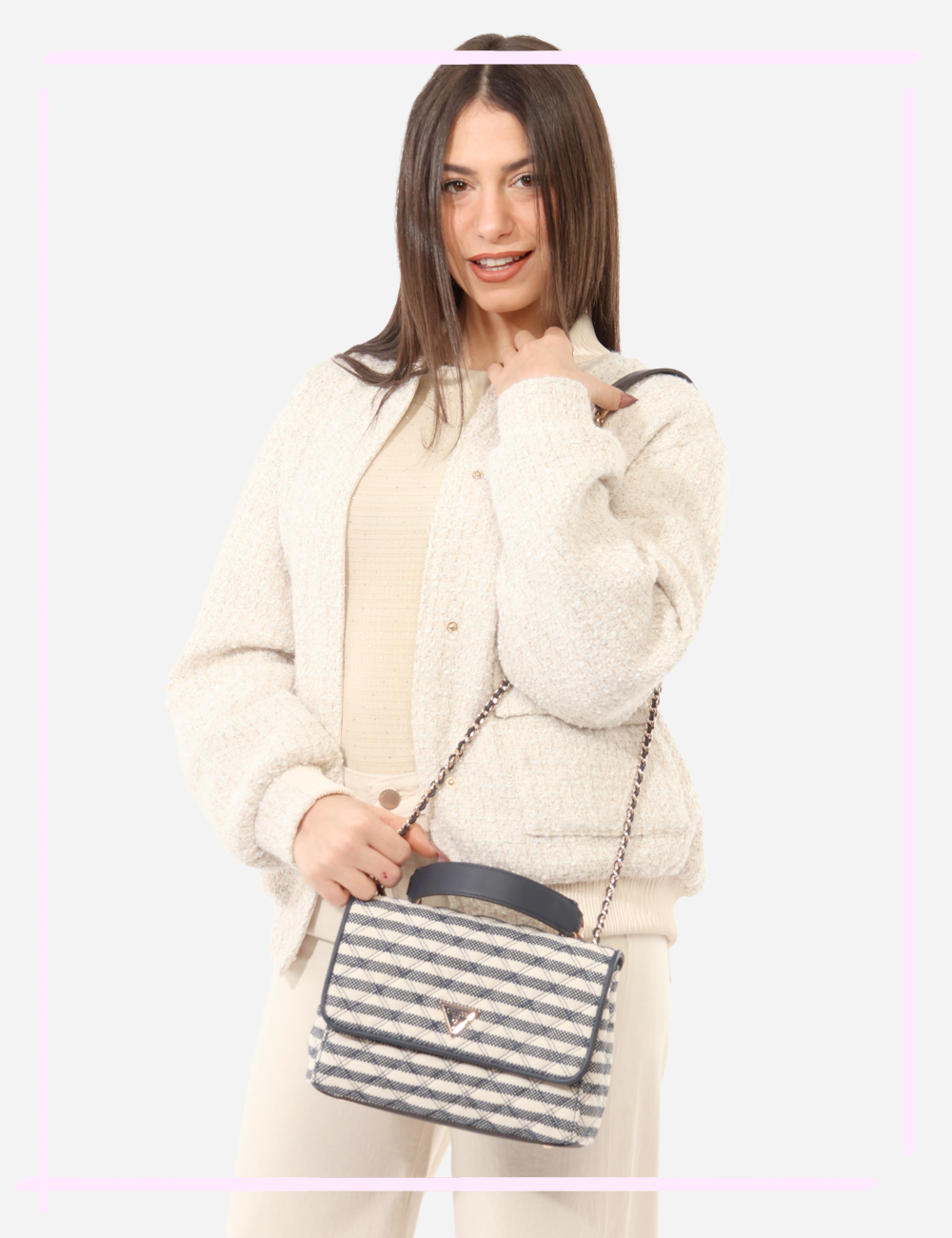 Realizzata con una composizione di qualità in 60% poliestere e 40% cotone, questa borsa garantisce leggerezza, resistenza e una piacevole sensazione al tatto, risultando ideale per un utilizzo quotidiano durante la stagione calda. La borsa con tessuto trapuntato a contrasto e catena argento si abbina facilmente a un pantalone blu o panna con camicia e scarpa bassa, ma completa con eleganza anche abiti leggeri e outfit dai toni neutri.