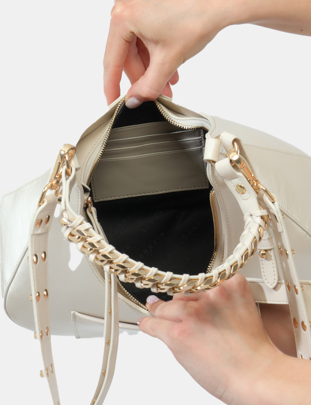 Fresca, luminosa e dal carattere deciso, questa borsa da donna firmata JOHN RICHMOND è l’accessorio perfetto per accompagnarti durante la stagione primavera estate. Il colore bianco, elegante e versatile, illumina ogni look, mentre la tracolla con borchie dorate aggiunge un tocco grintoso e contemporaneo, perfetto per chi ama distinguersi con stile.