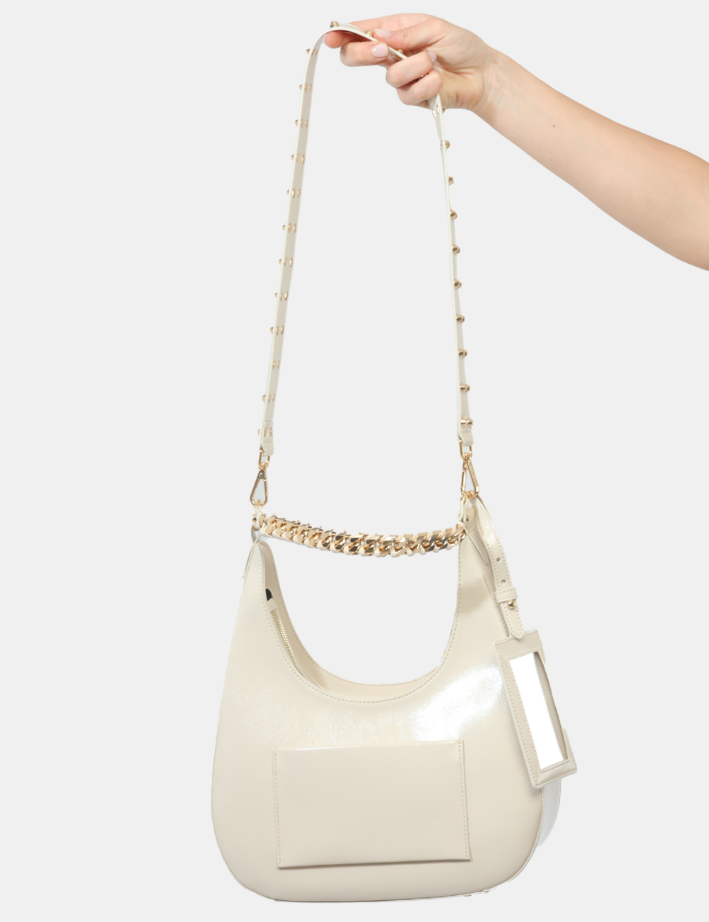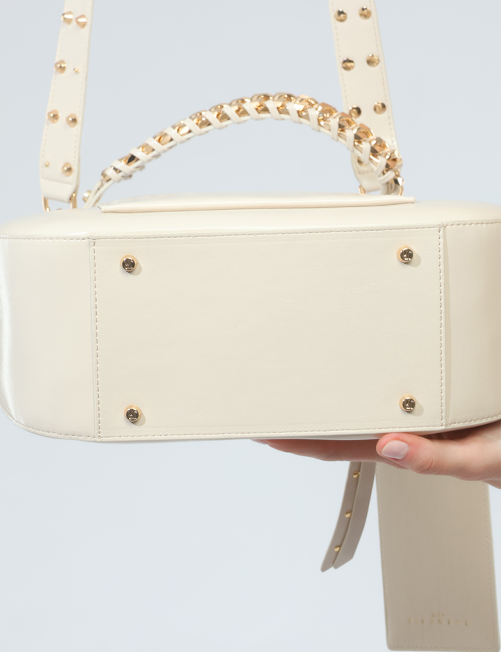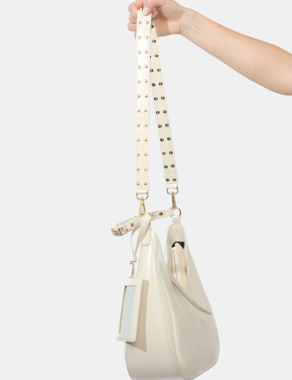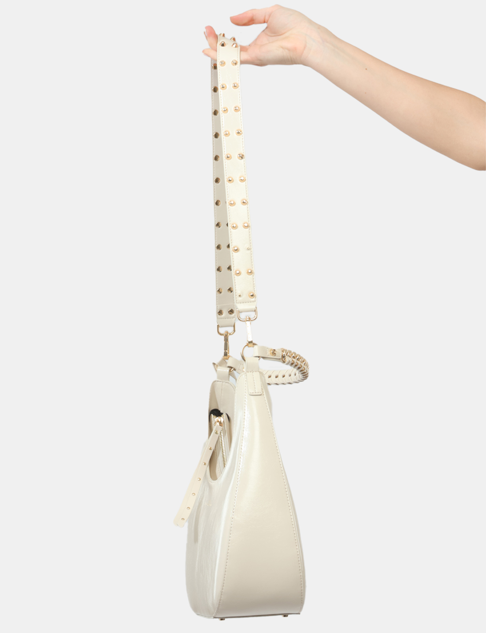 La borsa da donna adatta alla primavera estate è perfetta da indossare nel tempo libero, durante una passeggiata in città o per un aperitivo all’aperto, quando vuoi aggiungere un tocco di luce al tuo outfit. Questa borsa con tracolla con borchie dorate si abbina facilmente a un look casual con jeans chiari e top leggero, ma si presta anche a outfit più femminili con abiti estivi o completi dai toni neutri.