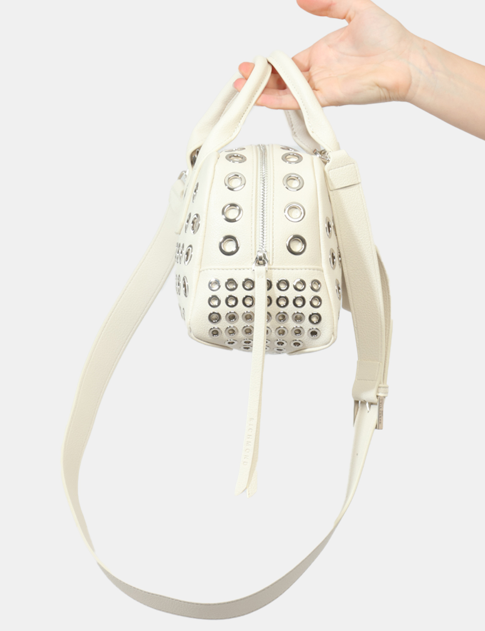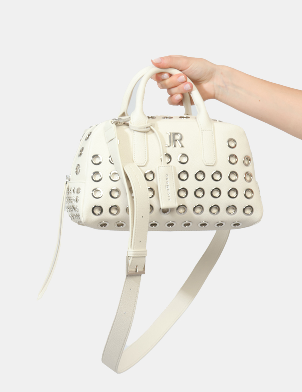 Luminosa, moderna e dal carattere deciso, questa borsa da donna firmata JOHN RICHMOND è l’accessorio perfetto per dare un tocco distintivo ai tuoi outfit. Il colore bianco, fresco ed elegante, incontra dettagli grintosi come le borchiette forate argento, creando un equilibrio perfetto tra raffinatezza e spirito contemporaneo.