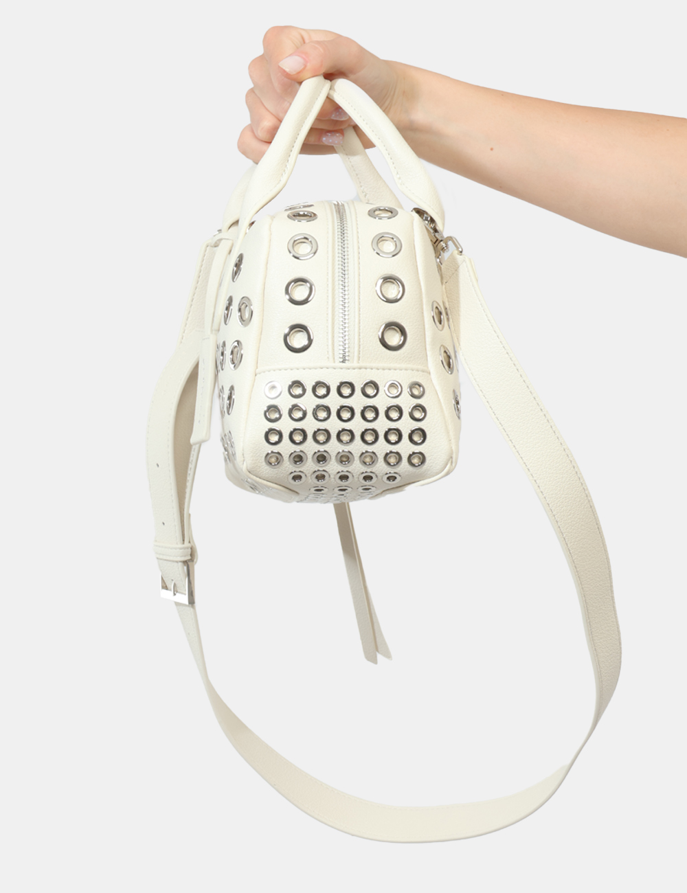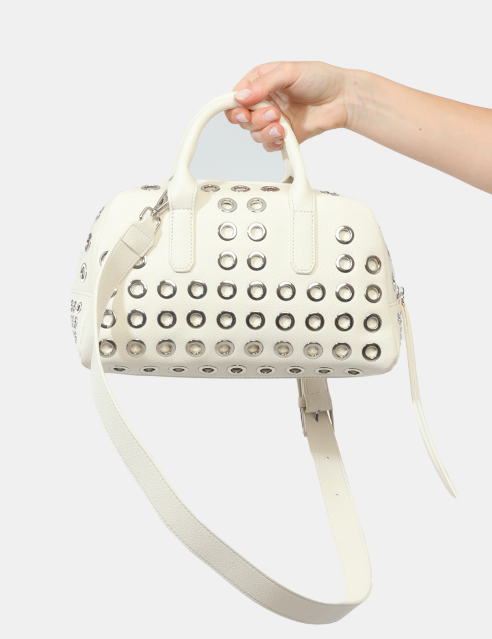 La borsa da donna adatta in tutte le stagioni è perfetta da indossare nel tempo libero, durante una passeggiata in città o per un’uscita informale, quando vuoi aggiungere luce e personalità al tuo look. Questa borsa con borchiette forate argento si abbina facilmente a un outfit casual con jeans e sneakers, ma è ideale anche con abiti chiari o total white per un effetto fresco e raffinato.