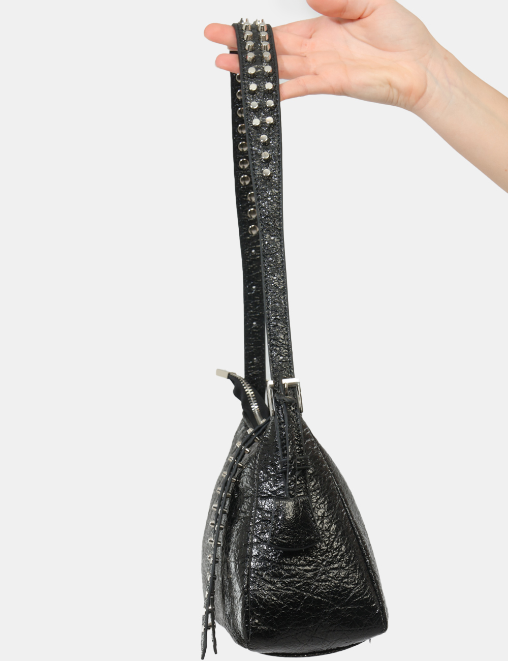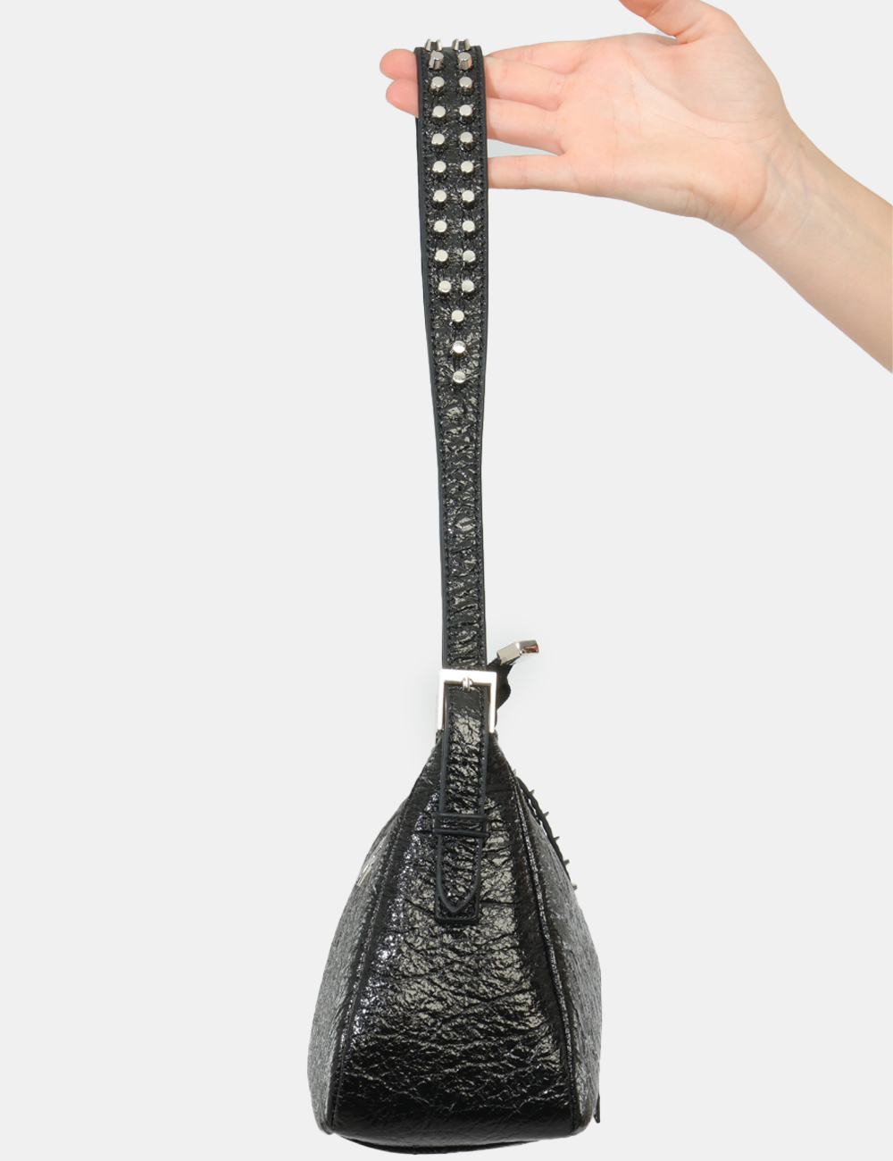 La borsa da donna adatta in tutte le stagioni si presta perfettamente a essere indossata nel tempo libero, per un’uscita in città o per completare un look quotidiano con un tocco distintivo. Questa borsa con con borchie argentate e tessuto increspato si abbina facilmente a un outfit casual con jeans e maglia, ma può anche valorizzare un look più ricercato, come un completo total black o uno stile urban chic.