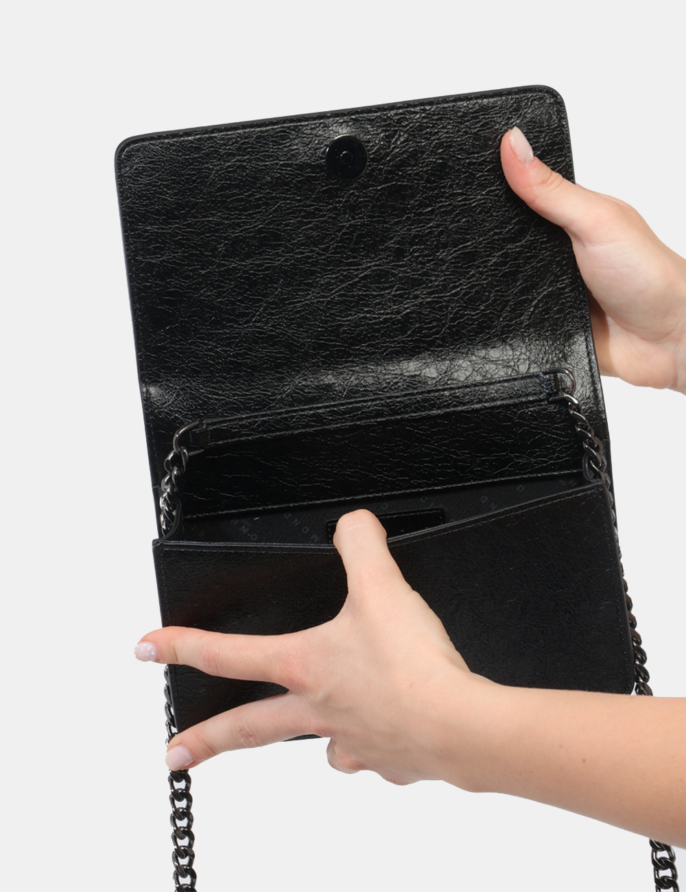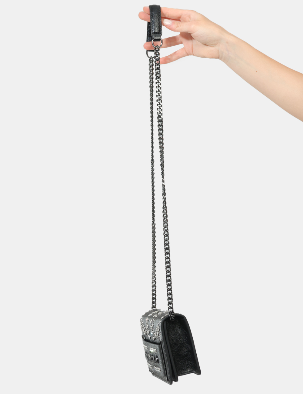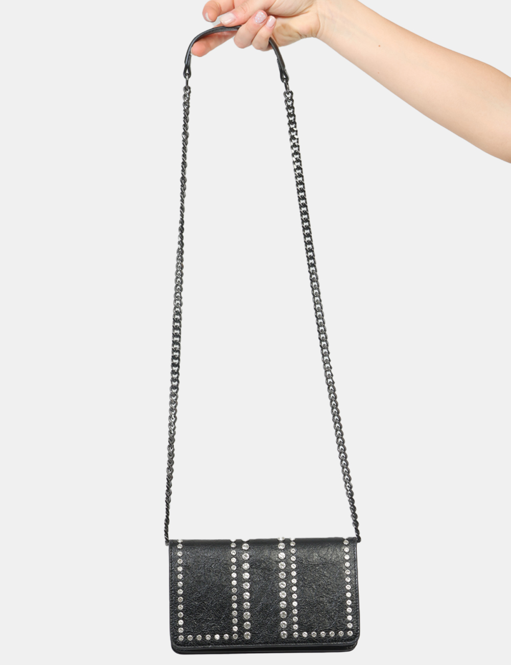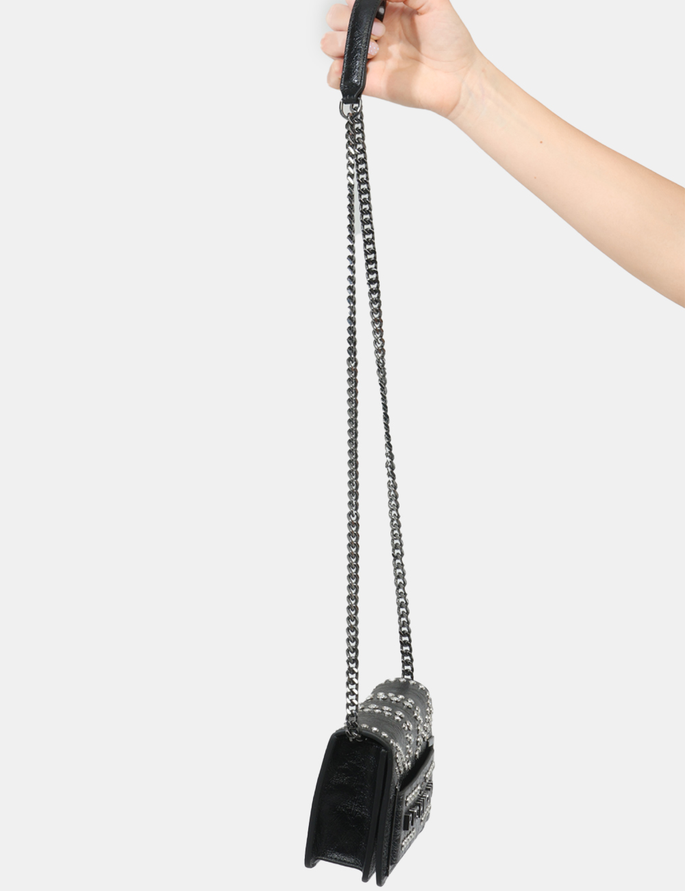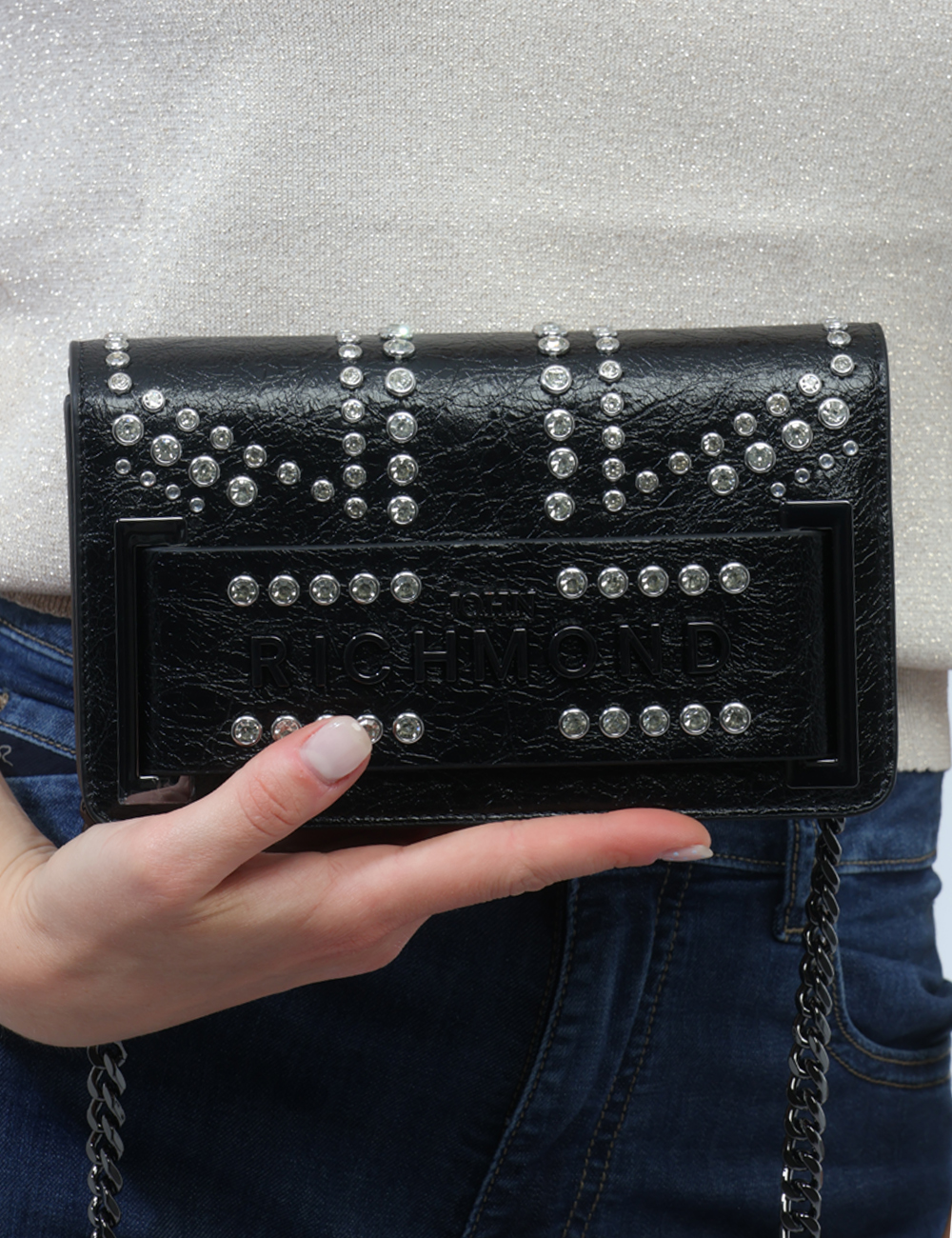 La borsa da donna adatta in tutte le stagioni è perfetta da indossare sia di giorno che di sera: puoi sceglierla per il tempo libero, un’uscita informale o un aperitivo, quando vuoi completare il tuo outfit con un dettaglio ricercato. Questa borsa con borchiette con strass argento e catena si abbina facilmente a un look casual con jeans e blazer, oppure a un outfit più elegante, come un abito nero per la sera.