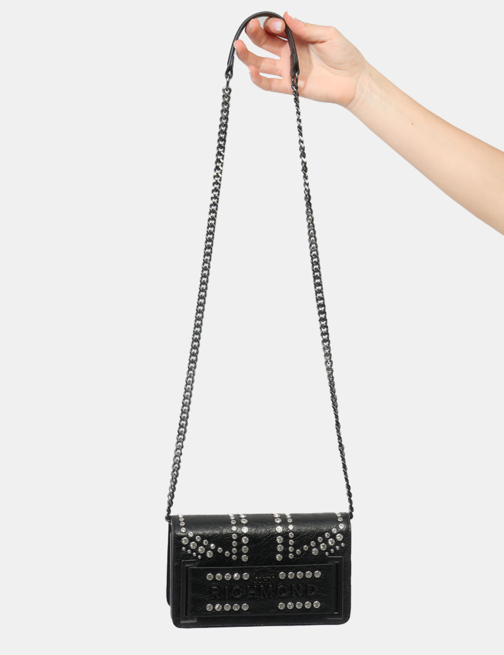 Compatta, luminosa e dal carattere deciso, questa borsa da donna firmata JOHN RICHMOND è l’accessorio perfetto per aggiungere personalità ai tuoi look. Il design nero, elegante e versatile, è arricchito da dettagli distintivi come le borchiette con strass argento e la catena, che donano un tocco contemporaneo e grintoso.