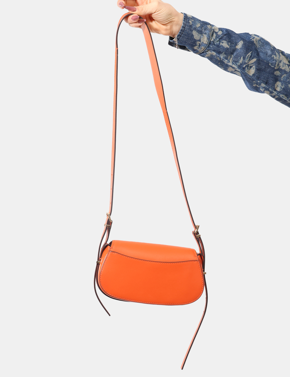 Realizzata in 100% pelle, si distingue per la sua struttura compatta ma funzionale e per l’intensa tonalità arancione, ideale per valorizzare outfit chiari o monocromatici. I dettagli dorati aggiungono un tocco raffinato e iconico, mentre la tracolla consente di indossarla comodamente a spalla o crossbody, adattandosi alle diverse esigenze della giornata.
