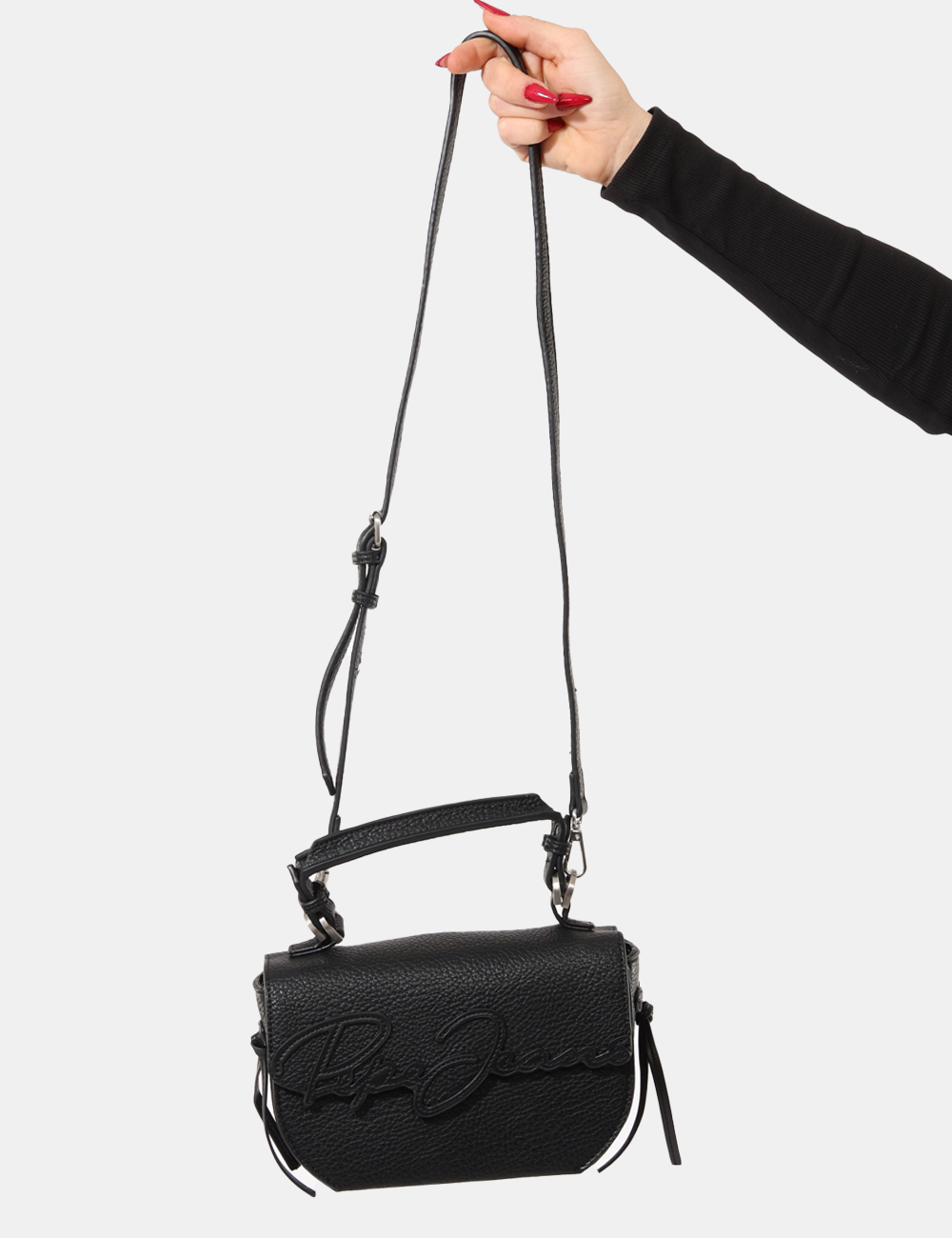 Borsa tracolla di piccole dimensioni, in total nero con logo brand sagomato, unico scompartimento con chiusura a bottone più taschina interna. L’indossatura è pratica e maneggevole grazie a manico più tracolla in tinta regolabile. Ideale per occasioni casual. Completa la tua collezione di borse.
