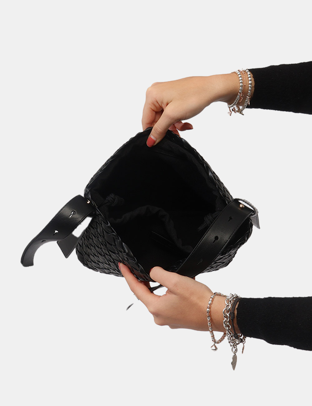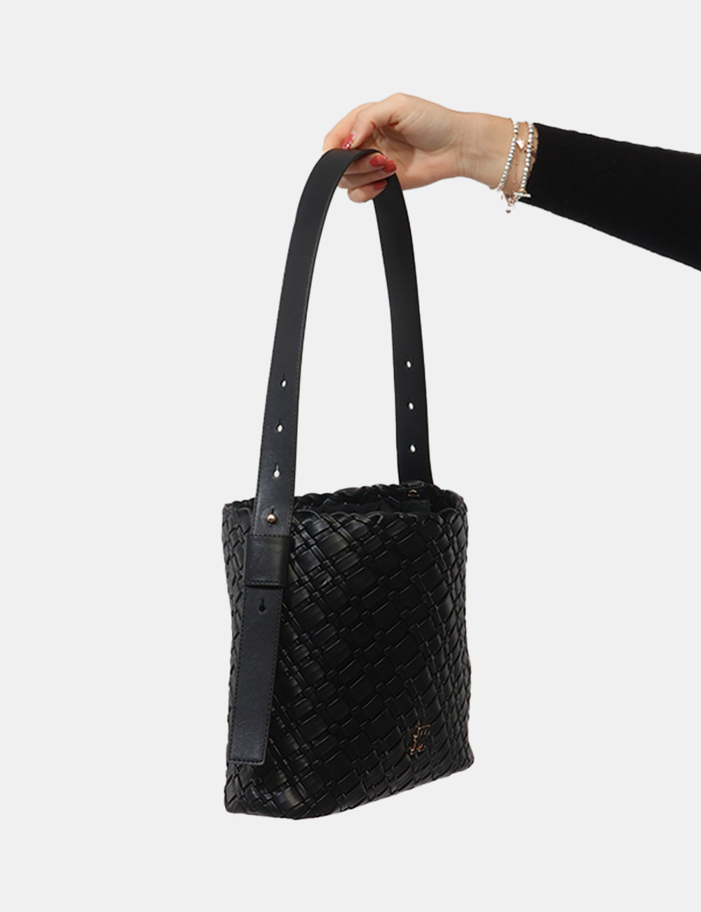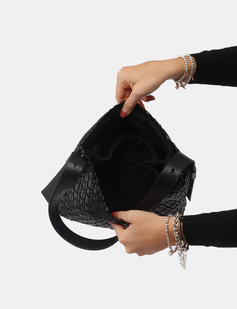 Il colore nero, intramontabile e versatile, incontra la lavorazione intrecciata creando un accessorio distintivo ma facile da abbinare, capace di valorizzare ogni outfit con semplicità.