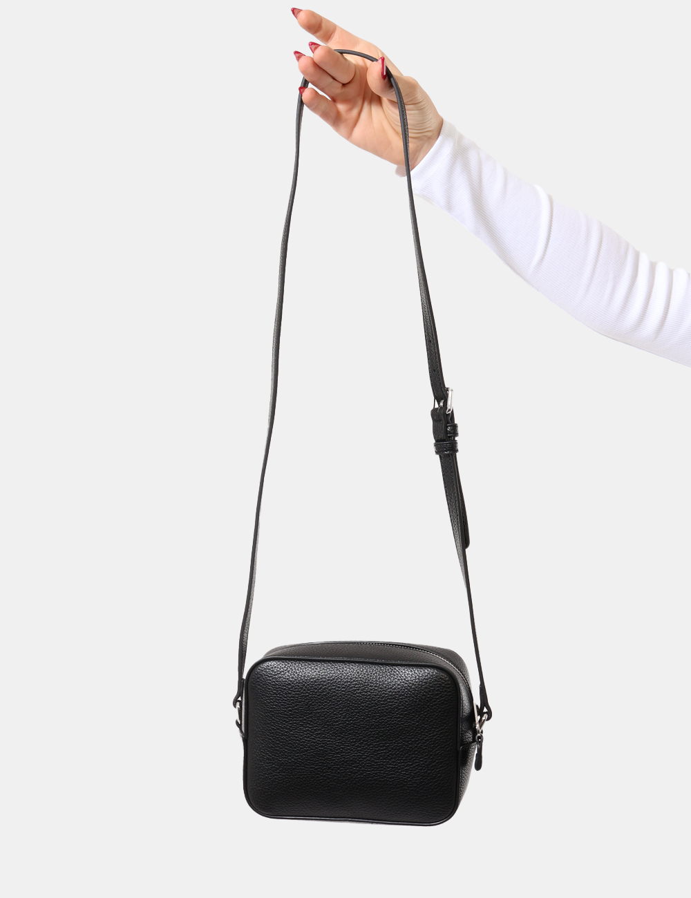 Borsa tracolla di piccole dimensioni in total nero, con unico scompartimento e chiusura a zip. L’indossatura è pratica e maneggevole grazie a tracolla in tinta regolabile. Questa borsa è ciò che le tue cose si meritano. Completa la tua collezione.