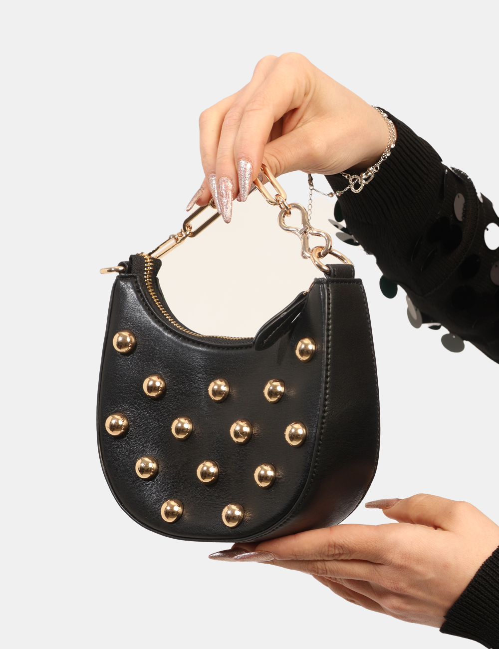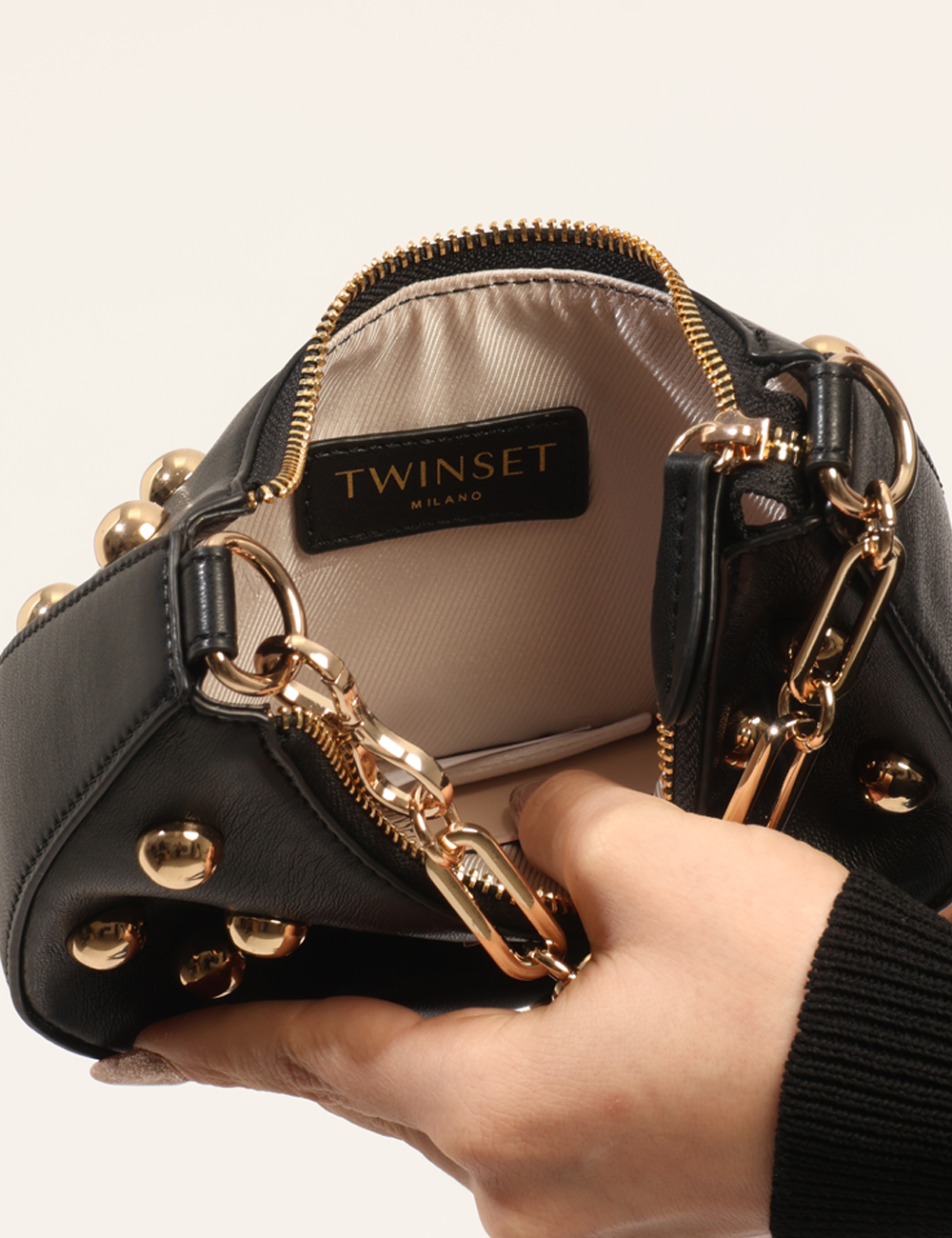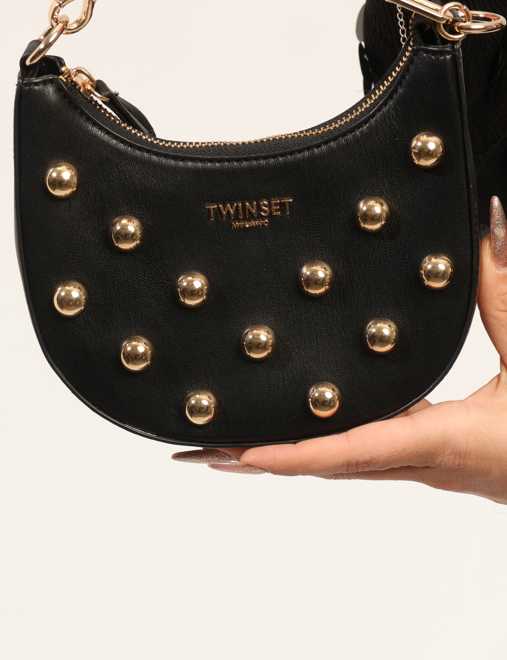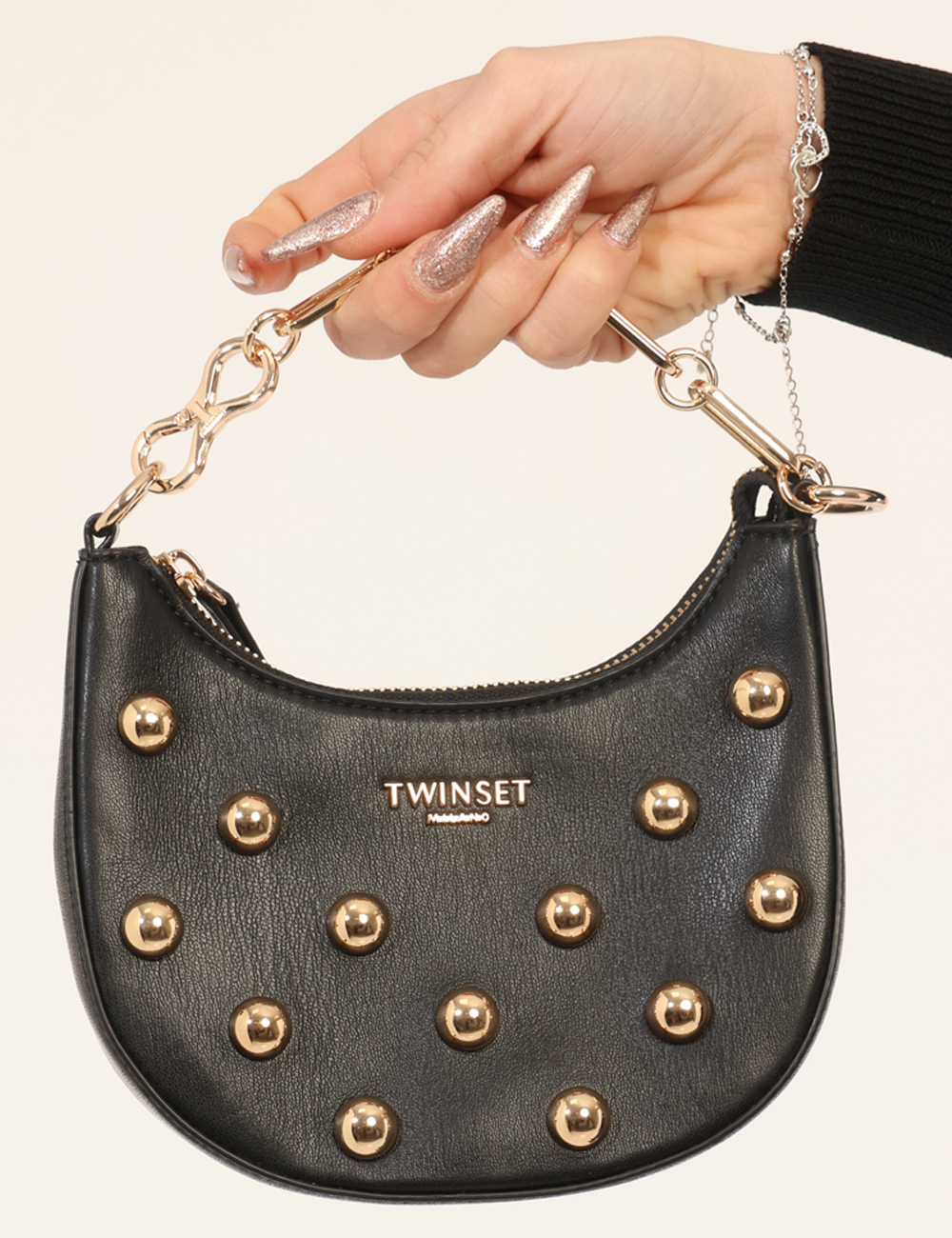 La Borsa TWIN SET Nera è un accessorio elegante e deciso pensato per completare con carattere i tuoi look della stagione più luminosa dell’anno. Questa borsa da donna adatta alla stagione primavera estate si distingue per la sua tonalità nera intensa e versatile, una scelta sempre attuale che permette di creare outfit sofisticati e facili da abbinare. Il design compatto è arricchito da borchie e catena dorata, dettagli che donano luminosità e personalità al modello, rendendo questa borsa con borchie e catena dorata un accessorio grintoso ma raffinato allo stesso tempo. Realizzata in 100% poliestere, offre leggerezza e resistenza, mantenendo una struttura definita e pratica per accompagnarti durante la giornata o nelle occasioni serali. Le dimensioni compatte, base inferiore 18 cm, altezza massima 12 cm e profondità 5 cm, permettono di portare con te gli oggetti essenziali con praticità senza rinunciare allo stile. La Borsa TWIN SET Nera è perfetta da indossare sia di giorno che di sera, ad esempio per una passeggiata in città, un aperitivo con le amiche o una cena informale durante le serate primaverili ed estive. Puoi abbinarla facilmente a un vestito elegante per un look femminile e sofisticato oppure a un completo moderno per uno stile più deciso e contemporaneo. Versatile e ricercata, rappresenta un accessorio ideale per arricchire il tuo guardaroba con un dettaglio di personalità. Tutti i prodotti disponibili su SecondaStrada.com sono originali e accuratamente selezionati. Codice articolo 261TB7172 DP CA.