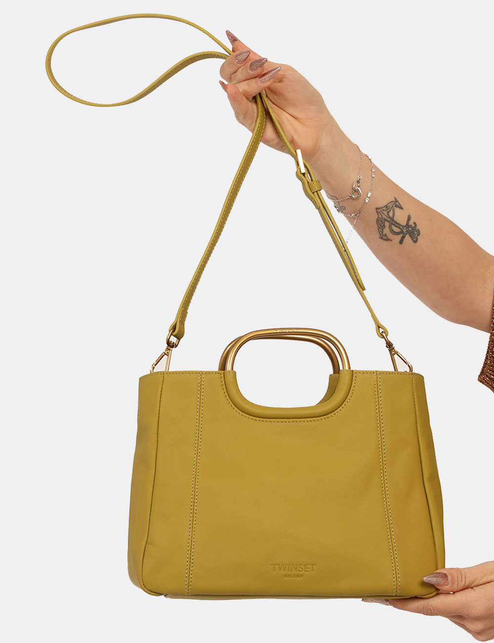 La Borsa TWIN SET Verde è un accessorio elegante e contemporaneo pensato per aggiungere carattere e raffinatezza ai tuoi look della stagione più luminosa. Questa borsa da donna adatta alla stagione primavera estate si distingue per la sua tonalità verde intensa e sofisticata, perfetta per dare personalità agli outfit quotidiani mantenendo uno stile fresco e femminile. Il design è valorizzato da manici dorati rotondi in metallo che donano luminosità e un tocco distintivo al modello, rendendo questa borsa con manici dorati rotondi in metallo un accessorio ricercato e originale. Realizzata in 100% pelle, offre qualità, resistenza e una piacevole sensazione al tatto, mantenendo una struttura solida ma elegante che accompagna con naturalezza la silhouette. Le dimensioni equilibrate permettono di organizzare con praticità tutto l’essenziale per la giornata: base inferiore 28 cm, altezza massima 20 cm e profondità 15 cm. Grazie alla sua capienza e alla forma strutturata, questa borsa è ideale per chi desidera un accessorio funzionale senza rinunciare allo stile. La Borsa TWIN SET Verde è perfetta da indossare nel tempo libero durante le giornate primaverili ed estive, ad esempio per una passeggiata in città, un pranzo all’aperto o un aperitivo con le amiche. Puoi abbinarla facilmente a jeans e sneakers per un look casual moderno oppure a un vestito leggero per uno stile più femminile e raffinato. Versatile e sofisticata, rappresenta l’accessorio ideale per completare con personalità il tuo guardaroba della stagione primavera estate. Tutti i prodotti disponibili su SecondaStrada.com sono originali e accuratamente selezionati. Codice articolo 261TD8451 DP CA.