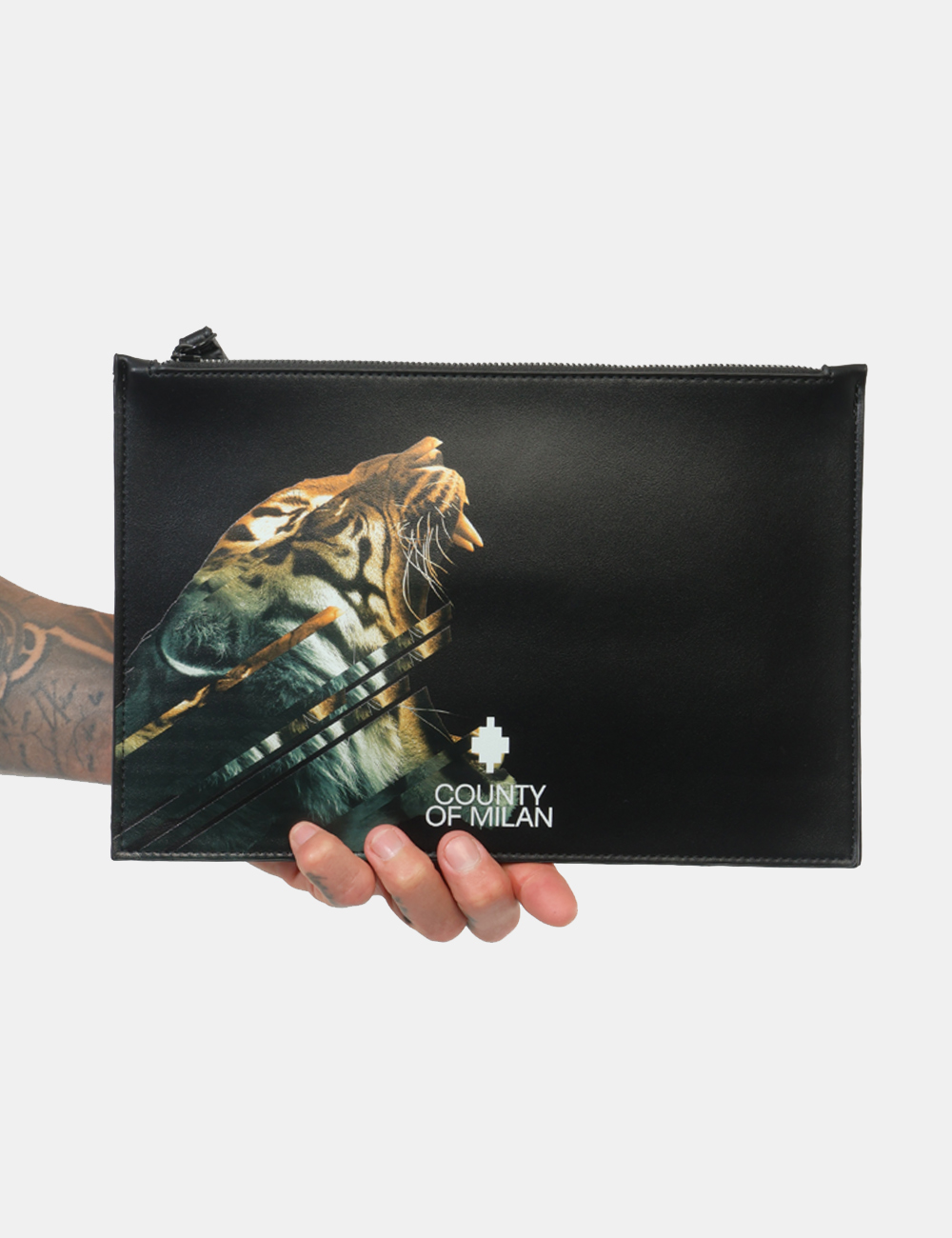 Il design è valorizzato dalla distintiva stampa tigre, elemento grafico iconico che dona personalità e rende il modello immediatamente riconoscibile. Le dimensioni compatte – base inferiore di 30 cm, altezza massima di 19 cm e profondità di 1 cm – la rendono perfetta per contenere l’essenziale, come smartphone, documenti e piccoli oggetti personali, mantenendo tutto in ordine e a portata di mano.