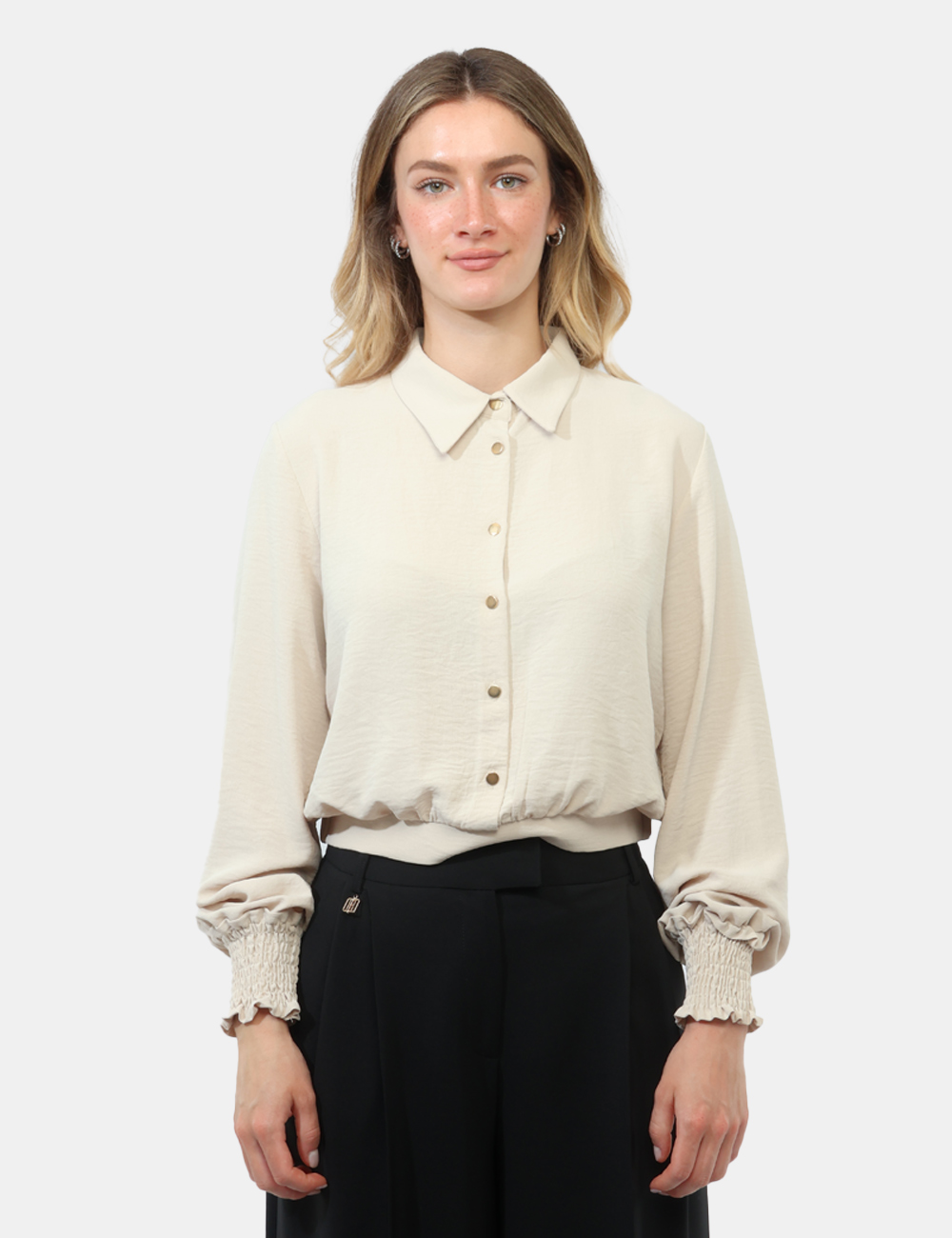 Realizzata in 100% poliestere, questa camicia da donna adatta in tutte le stagioni offre una vestibilità regolare che valorizza la figura senza rinunciare al comfort. I dettagli come la vita elasticizzata, i polsi arricciati e i bottoni dorati aggiungono un tocco femminile e ricercato, rendendo il capo elegante ma pratico allo stesso tempo.