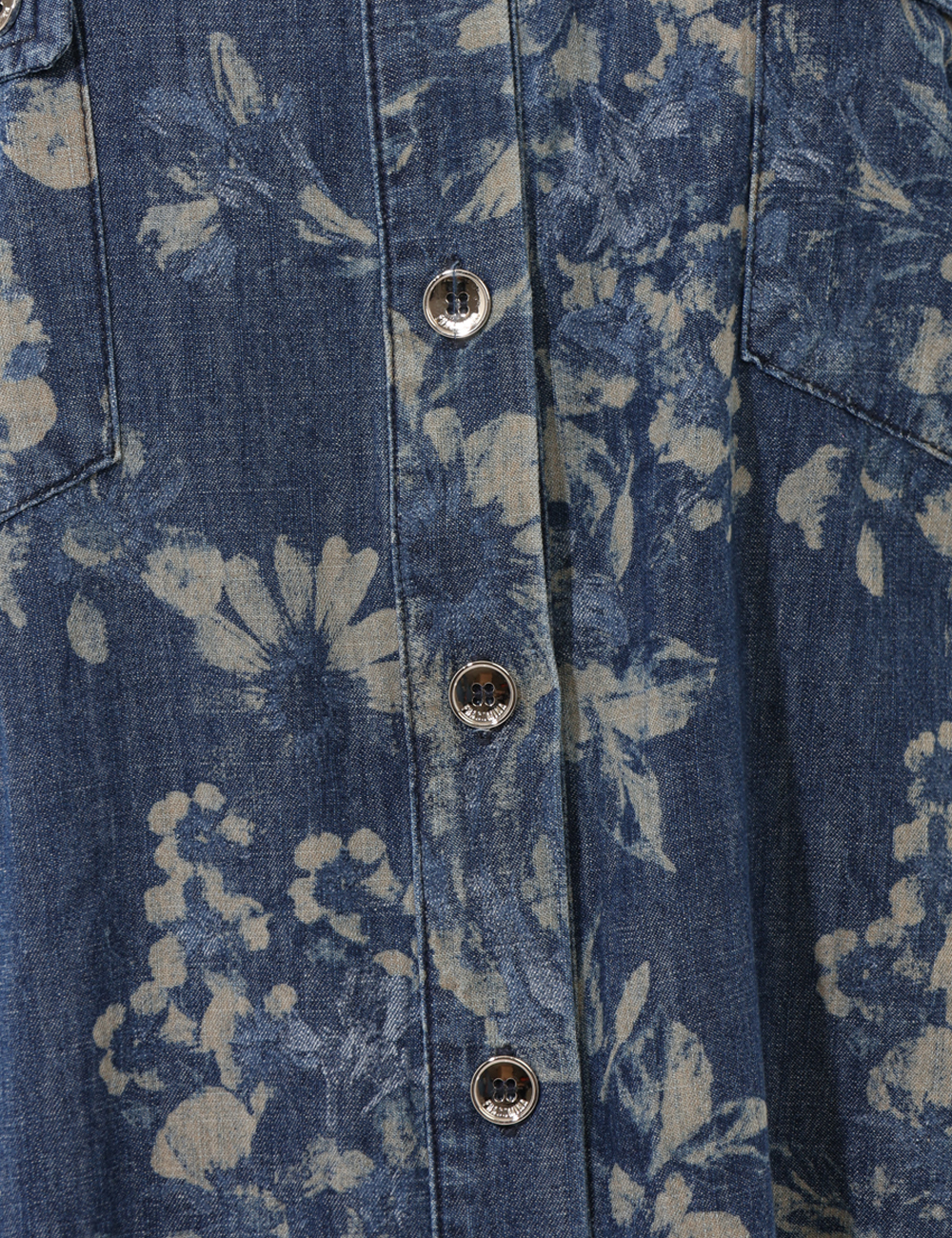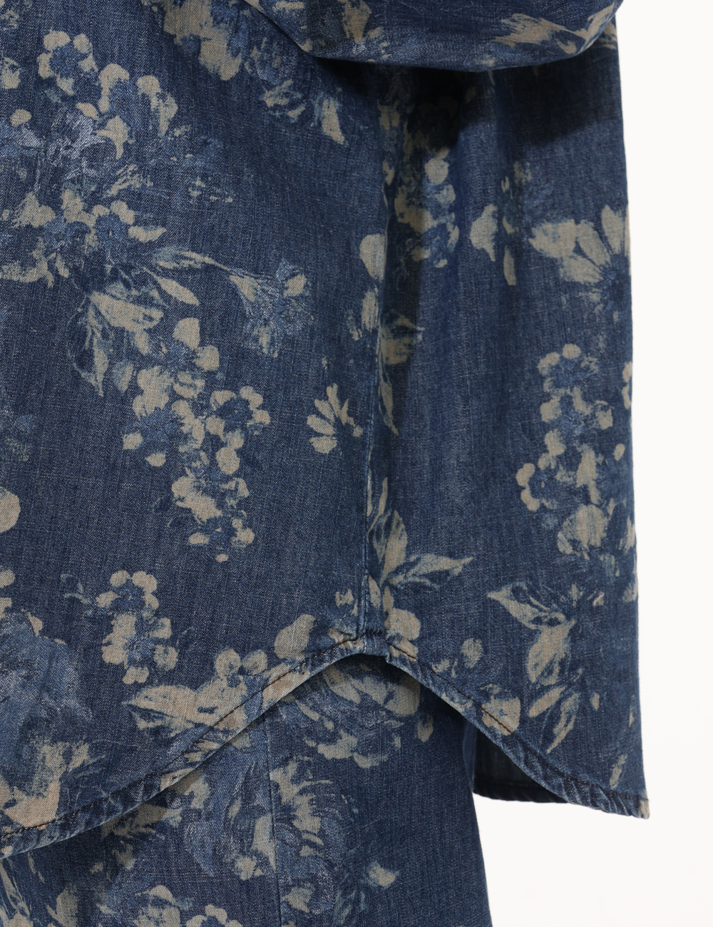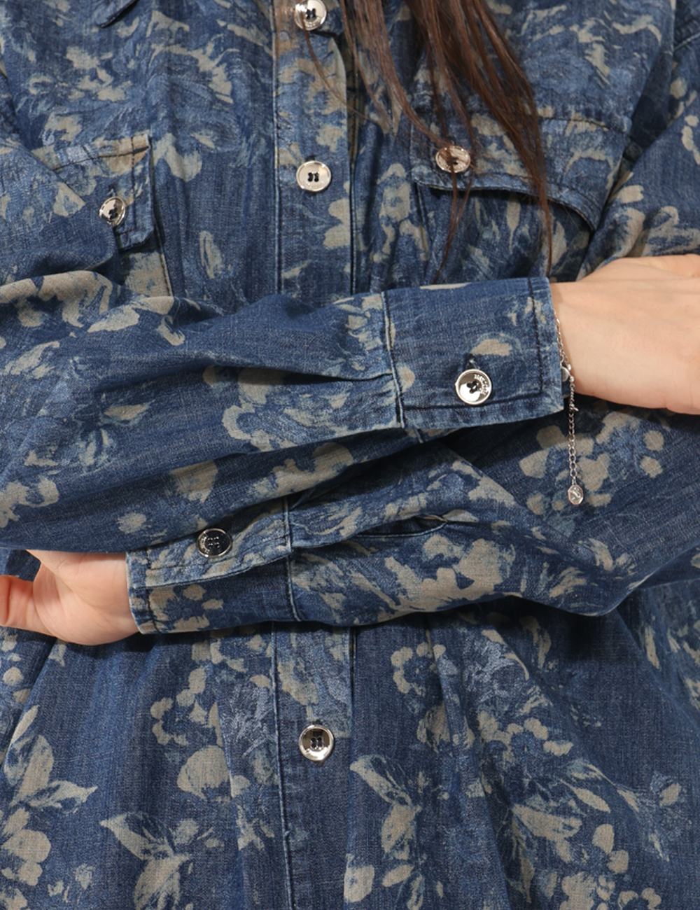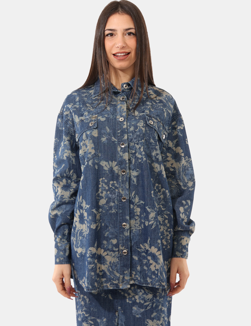 Il design è arricchito da dettagli curati: Camicia con in fantasia floreale allover, tasche, bottoni ad asola, elementi che donano carattere e un tocco romantico al look. La fantasia floreale su base blu aggiunge vivacità ed eleganza, rendendo il capo versatile e adatto a diverse occasioni. Le tasche frontali e la chiusura con bottoni completano il modello con praticità e stile.