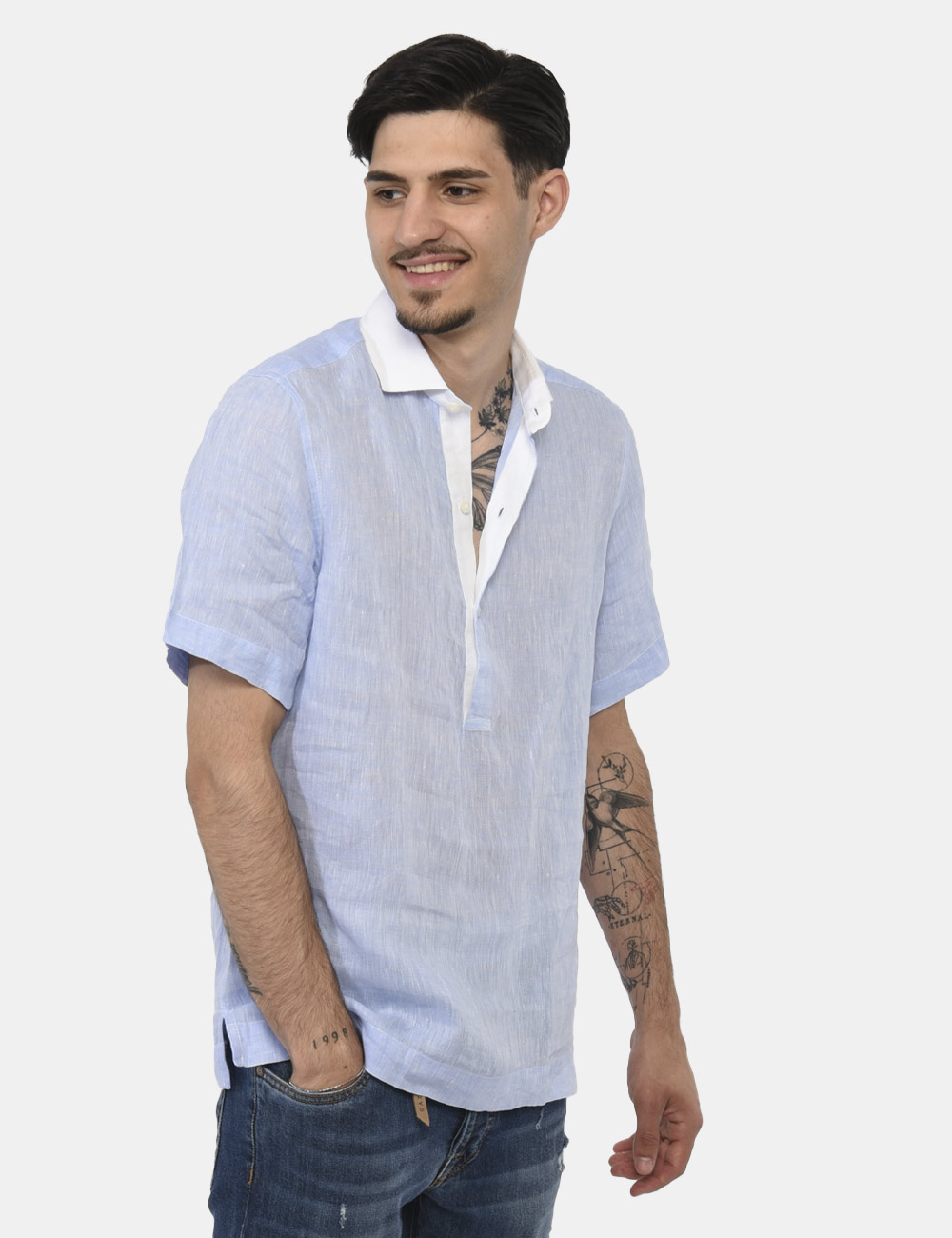 Camicia a maniche corte in total azzurro chiaro con bordino e colletto bianco. La vestibilità è morbida e pratica grazie a bottoni ad asola in tinta sul fronte . La camicia è adatta per occasioni casual. Dona un tocco di stile ai tuoi outfit.