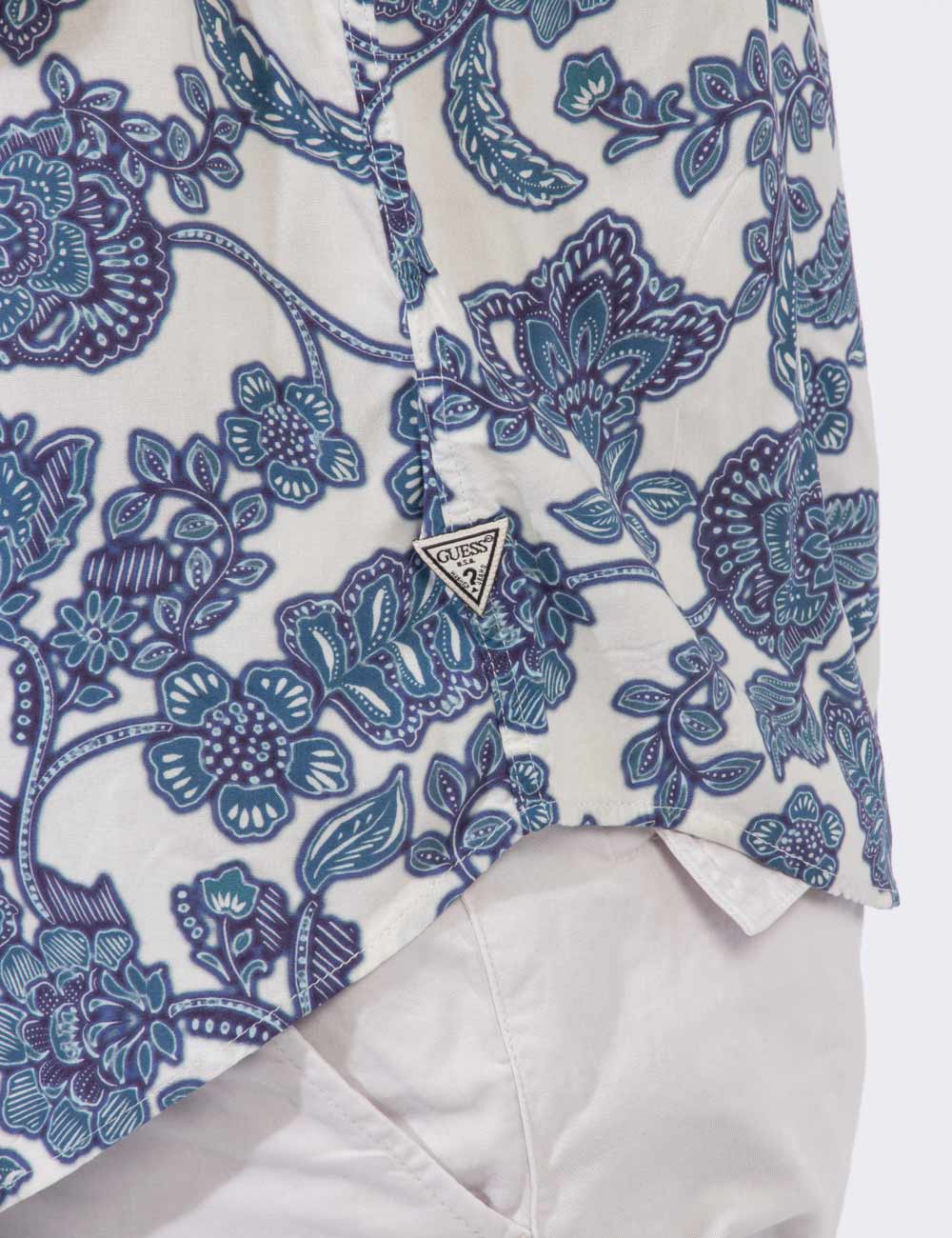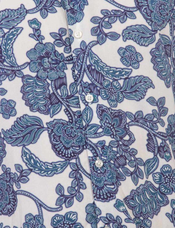 Camicia classica a maniche corte su base bianca con stampa floreale allover in tonalità tendente al blu. La vestibilità è morbida e pratica grazie a bottoni ad asola in tinta. La camicia è adatta per occasioni casual. Dona freschezza ai tuoi outfit.
