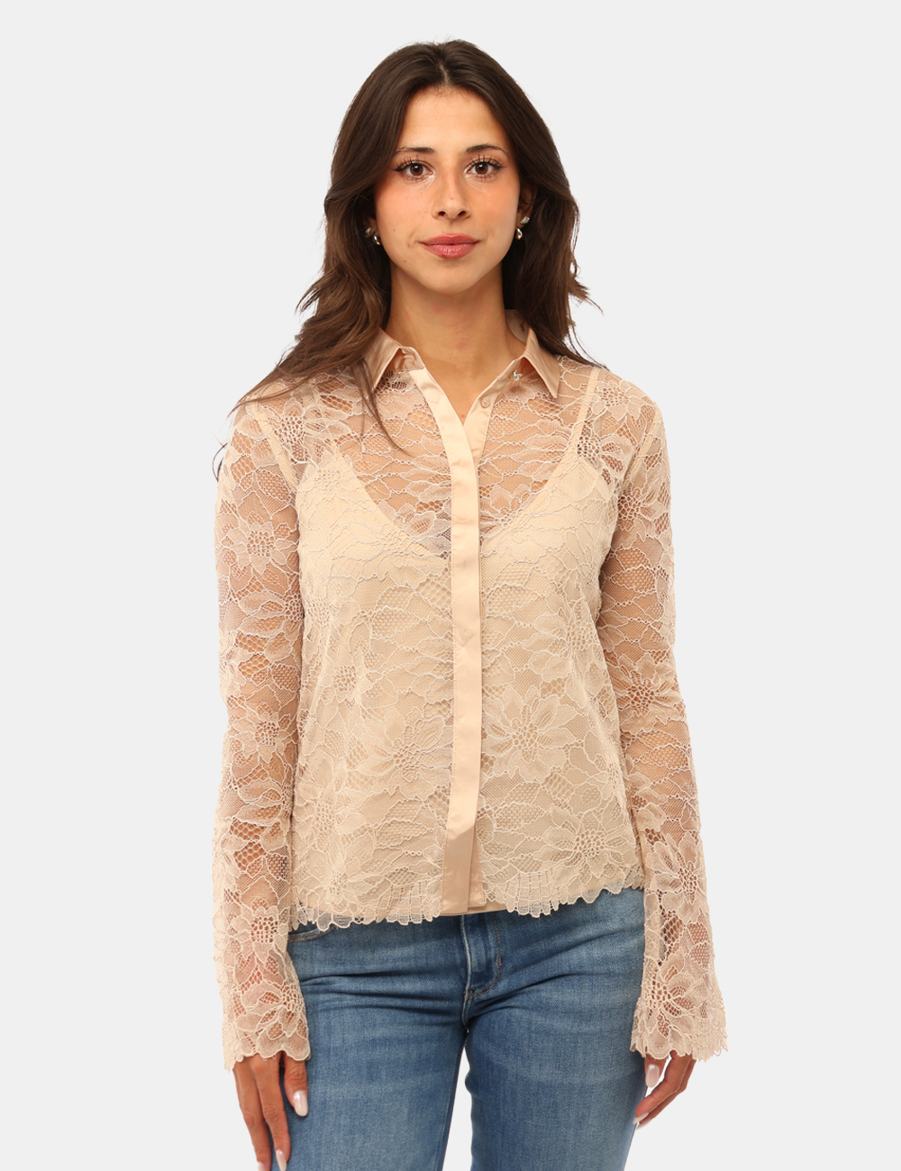 Questa Camicia da donna adatta alla stagione primavera estate si distingue per la cura dei particolari. La Camicia con tessuto semitrasparente ricamato, top in tinta, bottoni ad asola crea un elegante gioco di trasparenze, mantenendo comfort e praticità grazie al top coordinato incluso. Il ricamo aggiunge un effetto ricercato e femminile, mentre i bottoni ad asola completano il design con un dettaglio classico. La vestibilità è regolare: la modella è alta 165 cm e indossa la taglia S, per un fit armonioso che segue le linee del corpo senza risultare aderente.