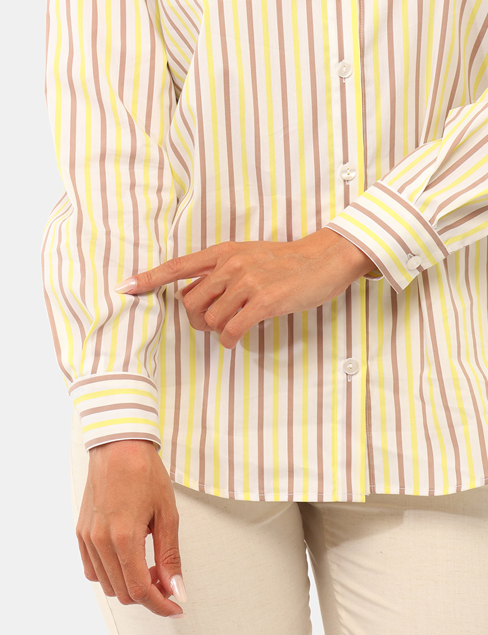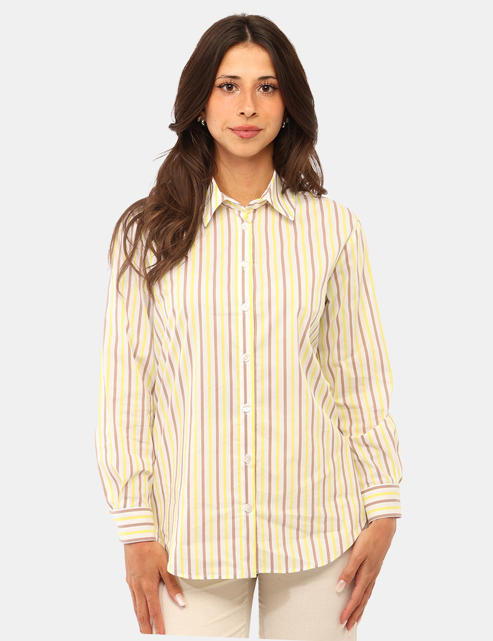 La Camicia MATERICA Bianca è il capo ideale per illuminare il tuo guardaroba con un tocco fresco e contemporaneo. Questa camicia da donna adatta alla stagione primavera estate si distingue per il fondo bianco luminoso impreziosito da una raffinata rigata giallo e marrone, un dettaglio che dona movimento e carattere senza rinunciare all’eleganza. I bottoni ad asola completano il design con una finitura curata e femminile. Realizzata in 72% cotone, 26% poliamide e 2% elastane, offre comfort, traspirabilità e una leggera elasticità che accompagna i movimenti con naturalezza. La vestibilità è regolare e valorizza la silhouette senza costringere. La modella è alta 165 cm e indossa la taglia 40, un riferimento utile per scegliere la misura più adatta a te. Questa Camicia con rigata giallo e marrone, bottoni ad asola è perfetta in ufficio abbinata a un pantalone sartoriale o a un tailleur coordinato per un look professionale e raffinato. Nel tempo libero puoi indossarla con jeans e sneakers per uno stile casual chic, fresco e curato. Versatile e luminosa, è un capo pensato per accompagnarti con eleganza nelle giornate primaverili ed estive.Tutti i prodotti su SecondaStrada.com sono originali. Codice articolo CAD01SP26 TCP216 SPLEND 1 OB.