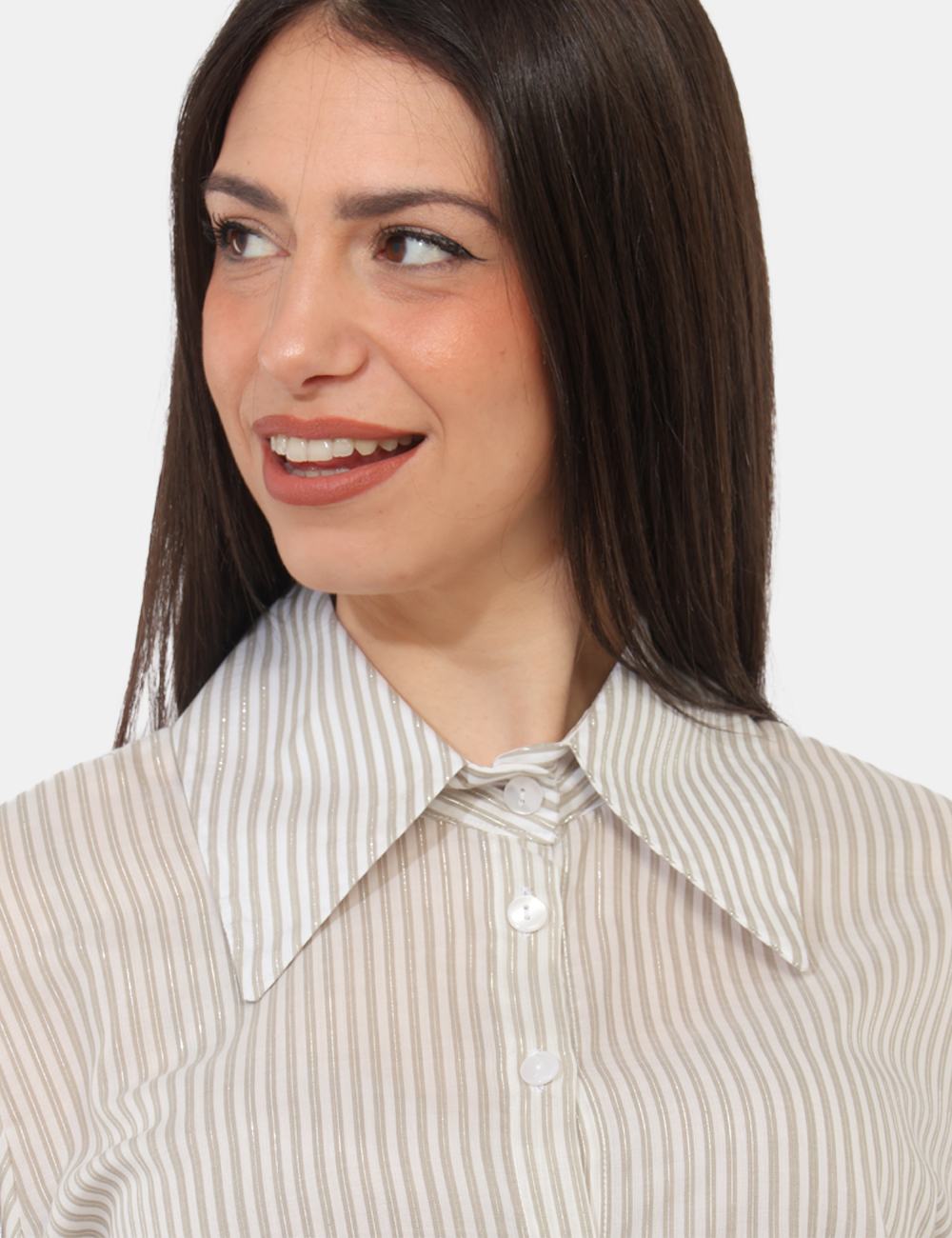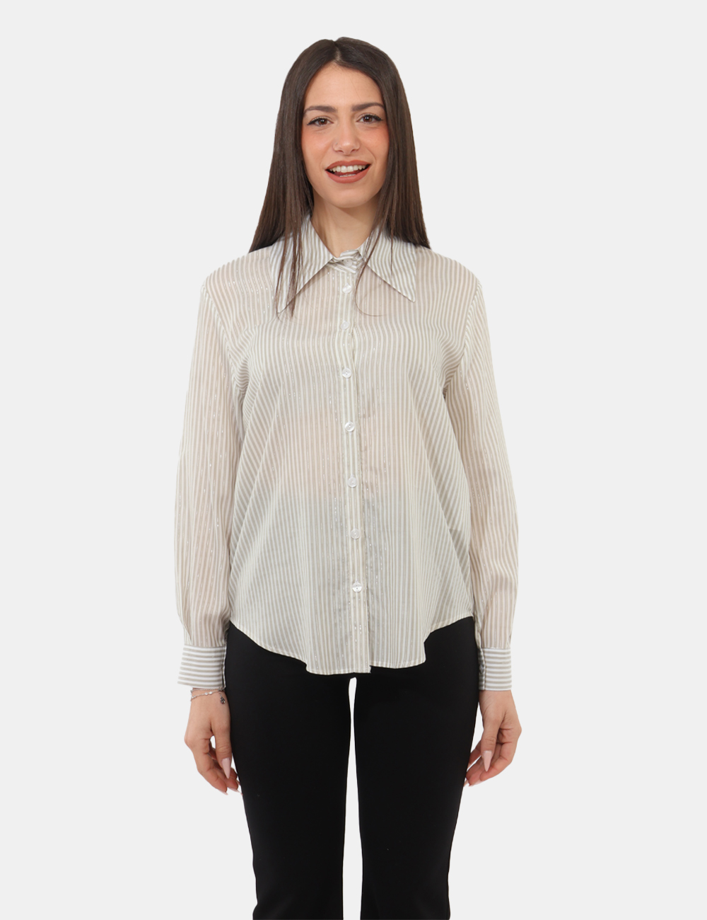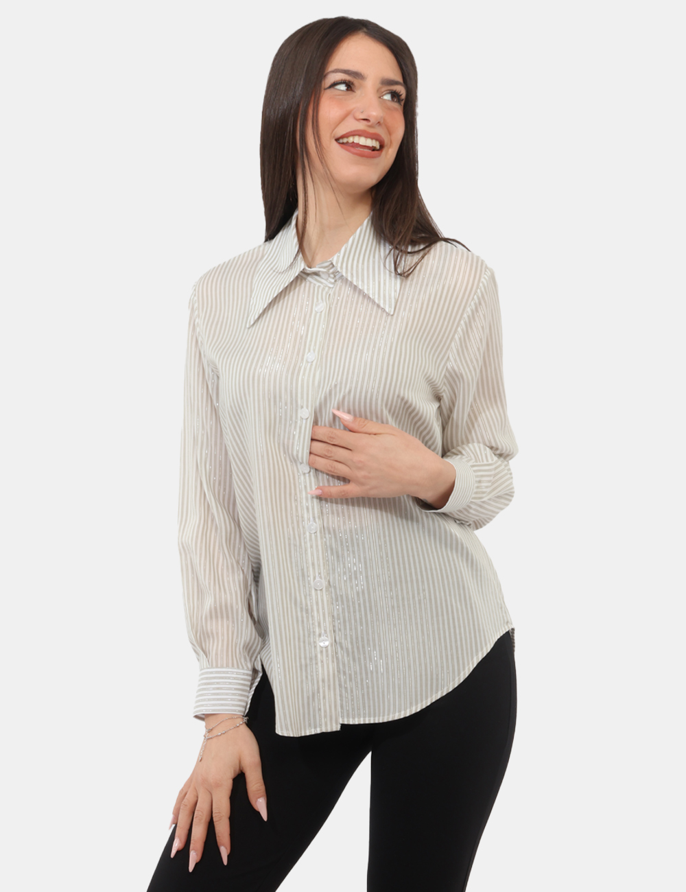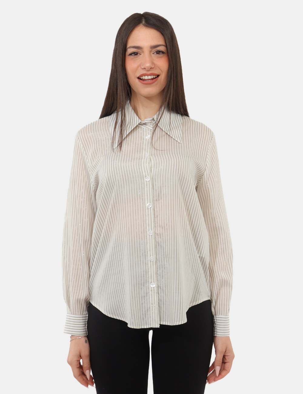 Fresca, luminosa e contemporanea, la camicia MATERICA Verde da donna è la scelta ideale per rinnovare il tuo guardaroba nella stagione primavera estate. Il suo design si distingue per le eleganti righe strette con filo lurex, un dettaglio raffinato che cattura la luce e dona movimento al capo, mantenendo uno stile discreto ma ricercato.