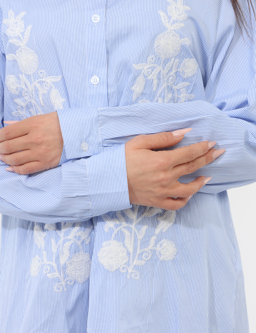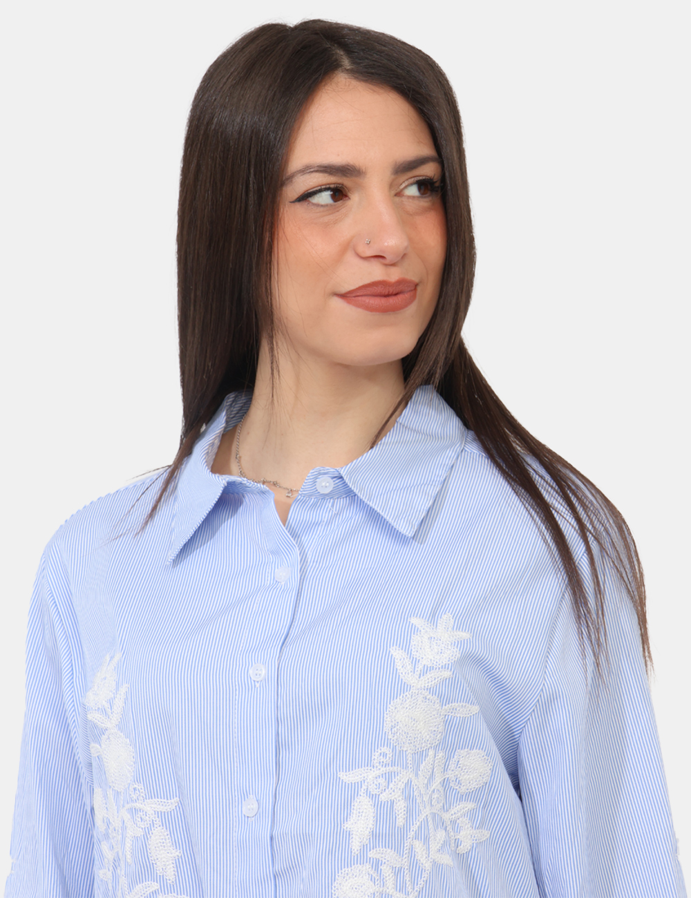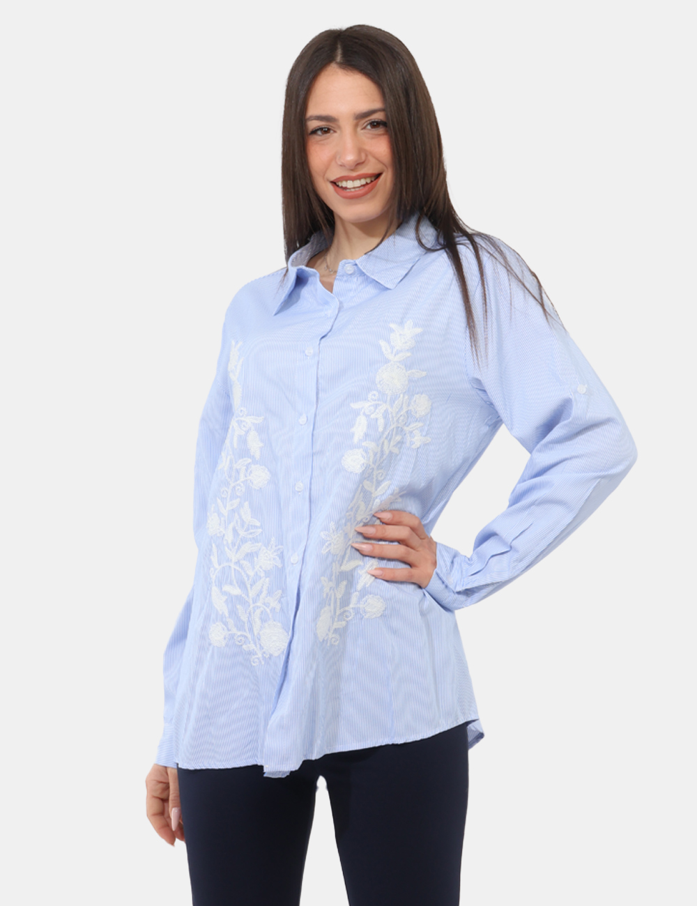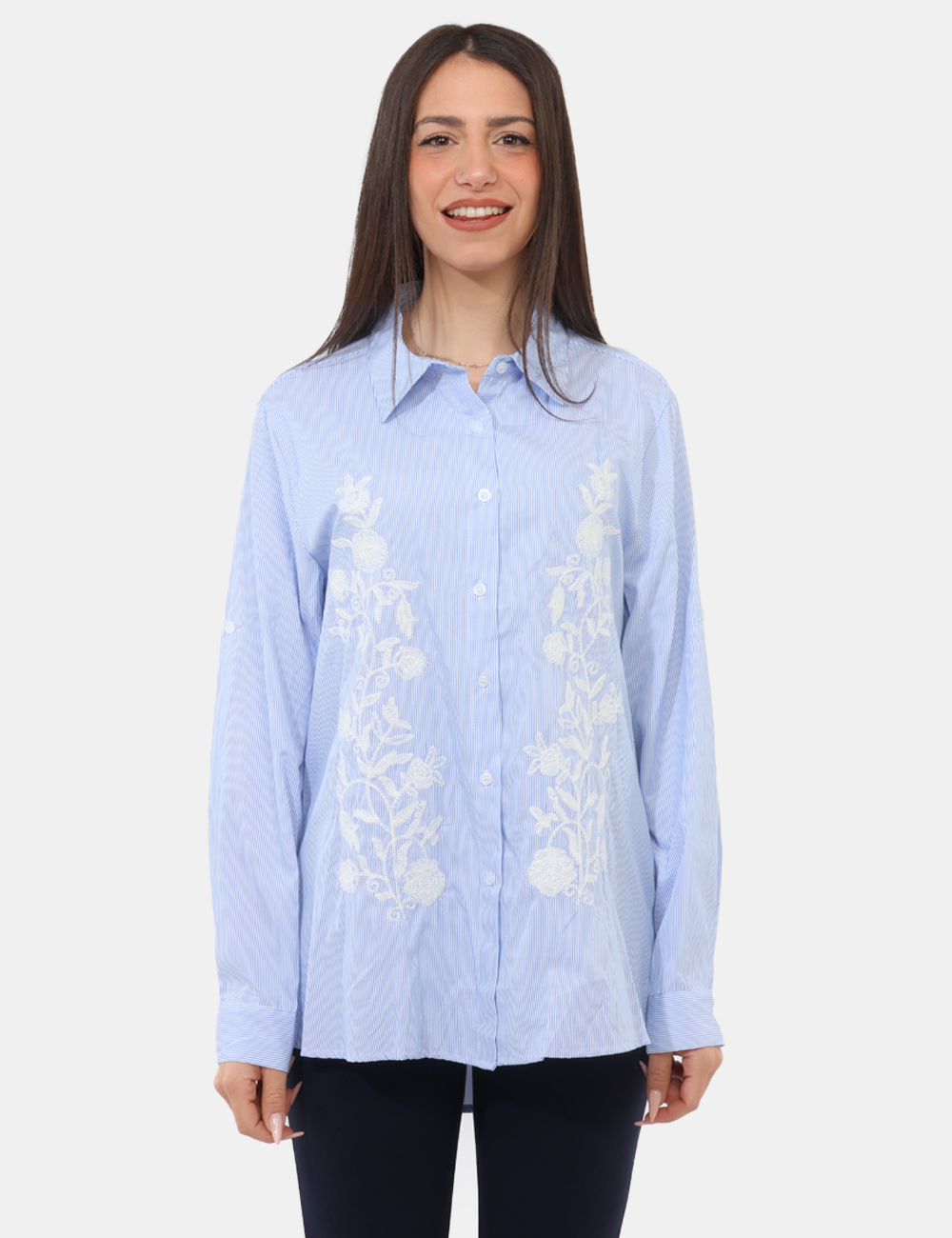 Realizzata in 100% poliestere, è leggera e pratica da indossare durante tutta la giornata. Il design si distingue per una camicia con ricami bianchi, che creano un contrasto raffinato con la tonalità azzurra, donando luminosità e un tocco femminile al capo. La vestibilità regolare assicura comfort e naturalezza nei movimenti: la modella è alta 165 cm e indossa una taglia S, offrendo un riferimento utile per la scelta.