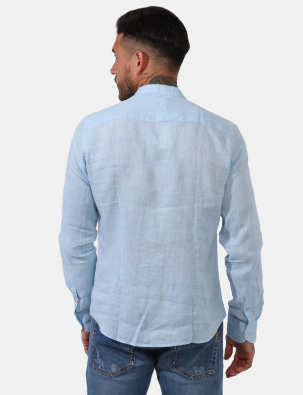 Camicia in lino ed in total azzurro pastello. Presente colletto alla coreana. La vestibilità è morbida e pratica grazie a bottoni ad asola in tinta. La camicia è adatta per occasioni casual/raffinate e facilmente combinabile. Indossala una volta e scopri di non poterne più fare a meno.
