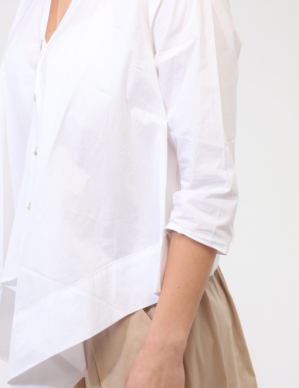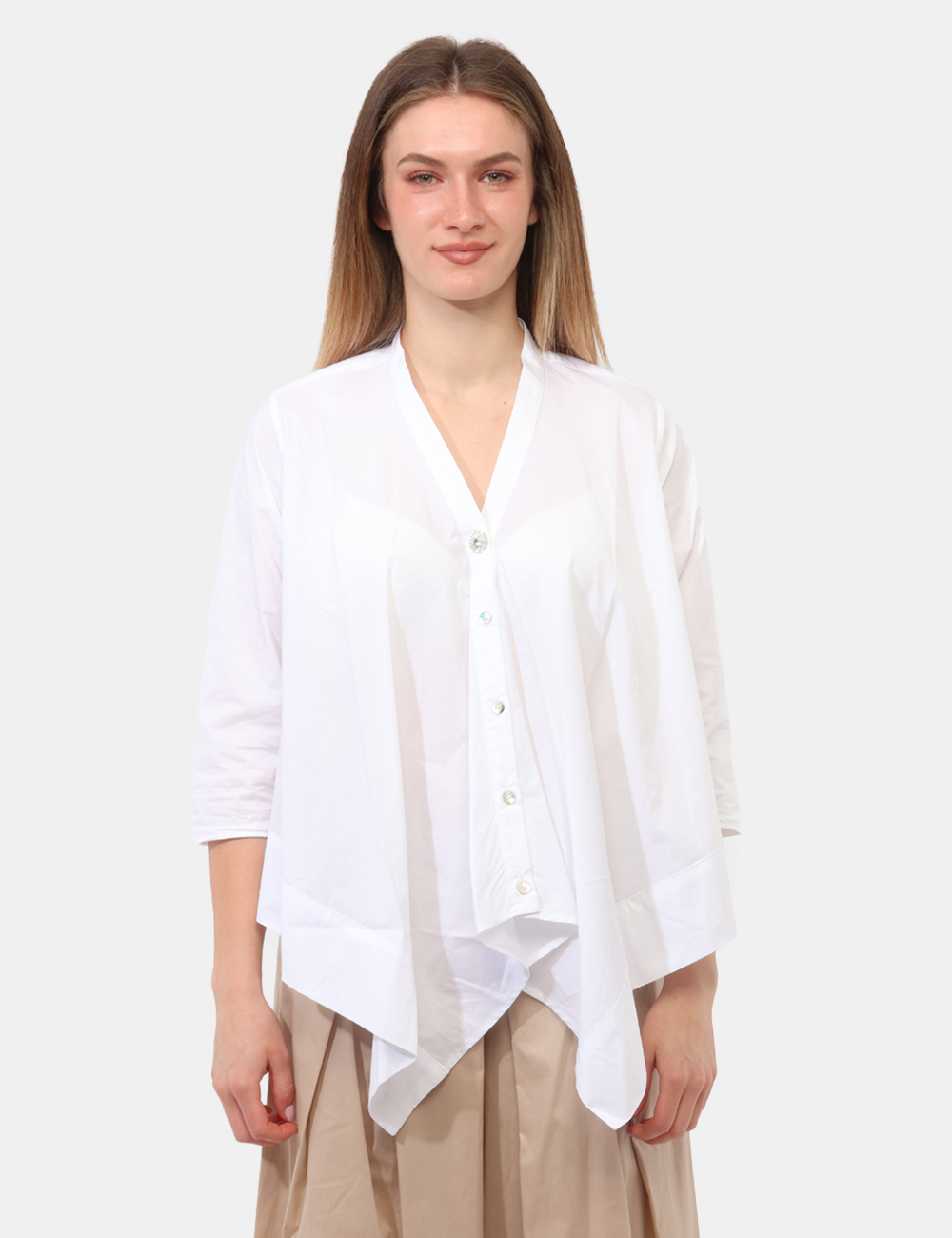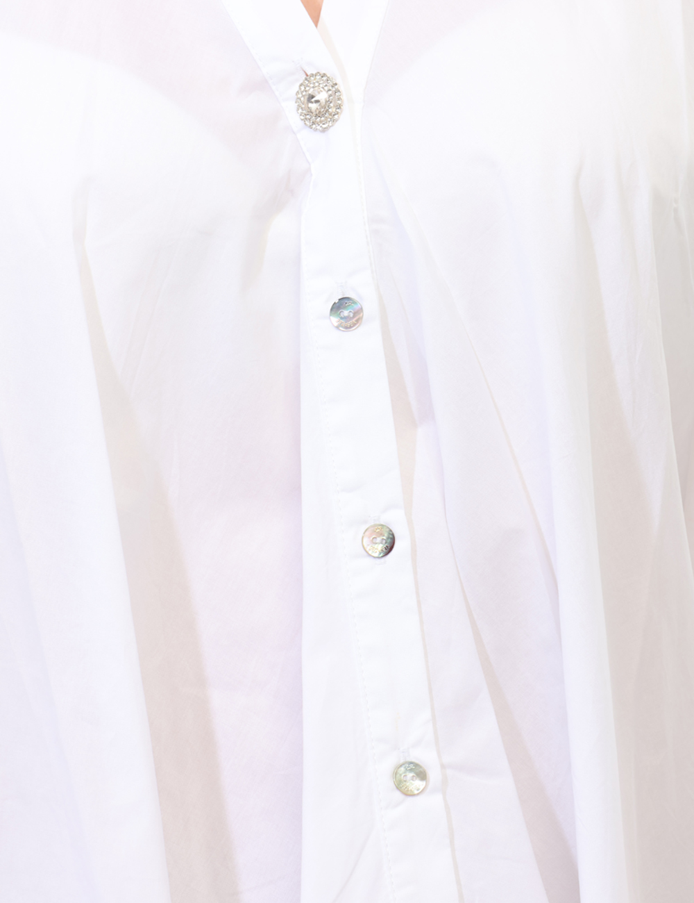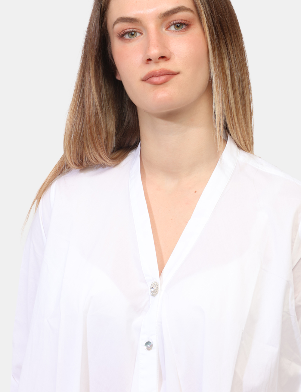 Questa camicia ampia e con bottone gioiello è ideale da indossare sia nel tempo libero che in ufficio, quando desideri un look curato ma confortevole, facilmente adattabile a diverse occasioni.