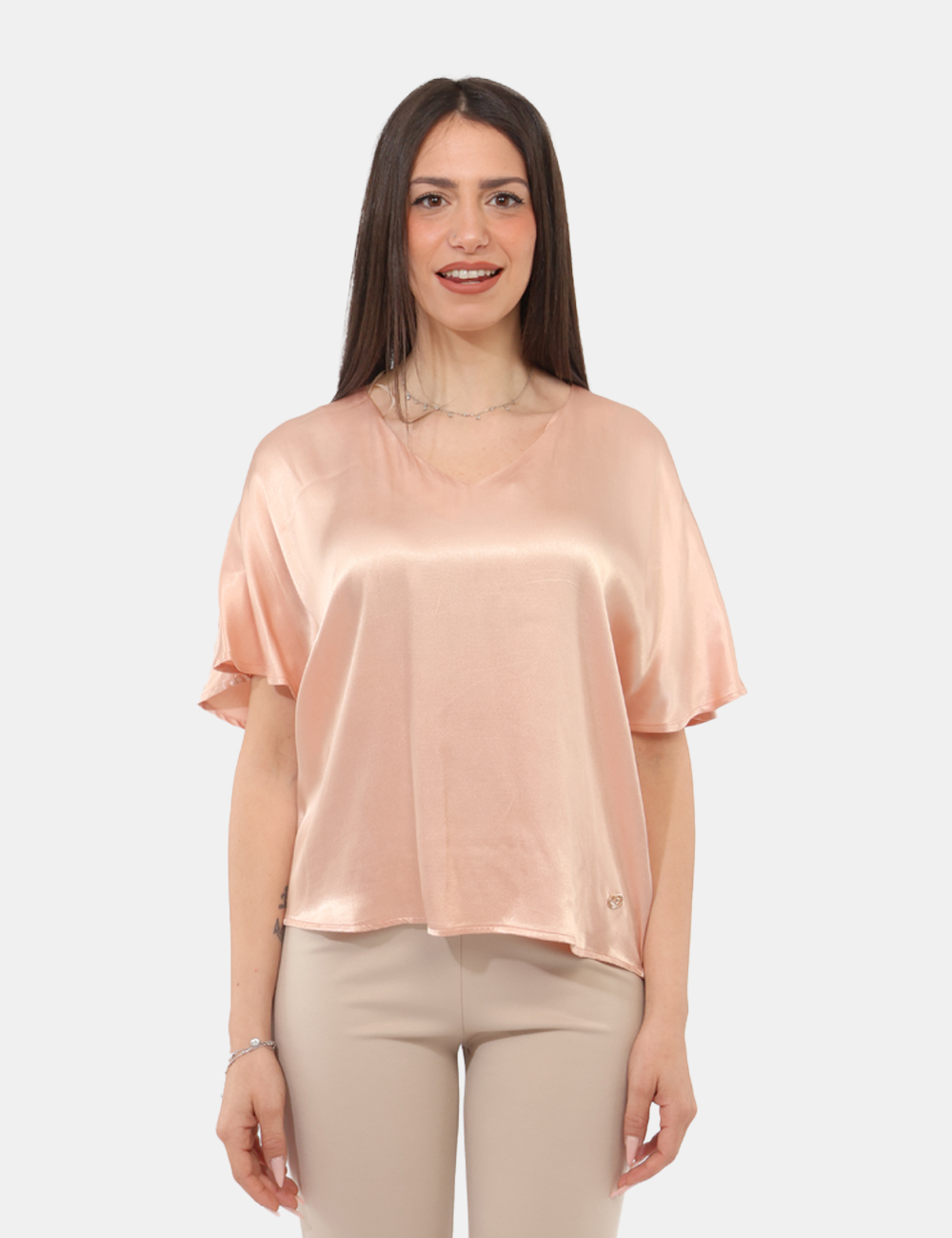 Il design si distingue per la sua linea morbida e fluida, pensata per garantire comfort senza rinunciare allo stile. Lo scollo a V valorizza il décolleté con discrezione, donando al look un tocco delicato e femminile. La vestibilità è regolare: la modella è alta 165 cm e indossa una taglia S.