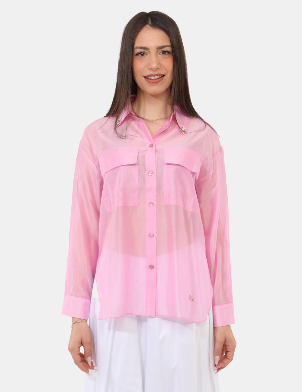 Questa camicia con strass sul collo e tasche è ideale da indossare nel tempo libero, sia di giorno che di sera, quando vuoi sentirti curata con semplicità e stile.