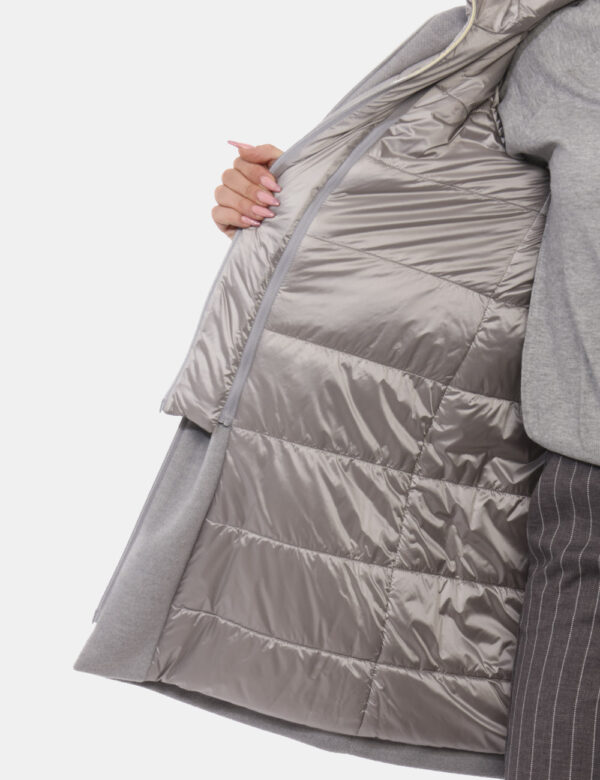 Cappotto lungo con cappuccio modello double, con piumino interno ed in total grigio chiaro. Presenti tasche a taglio trasversale. La vestibilità è morbida e pratica grazie a doppia zip dorata. Il cappotto è adatto per occasioni casual/eleganti. Dai un tocco di stile ai tuoi outfit.