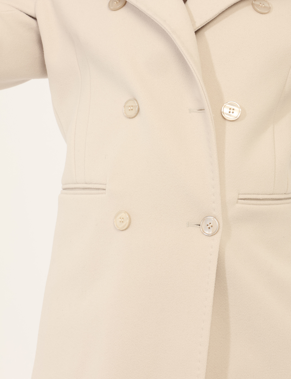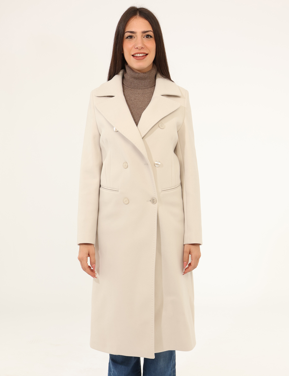 Cappotto lungo classico, in doppio petto, total beige con tasche fake. La vestibilità è morbida e pratica grazie a bottoni ad asola in tinta. Il cappotto è adatto per occasioni casual/raffinate. Indossalo per essere impeccabile.