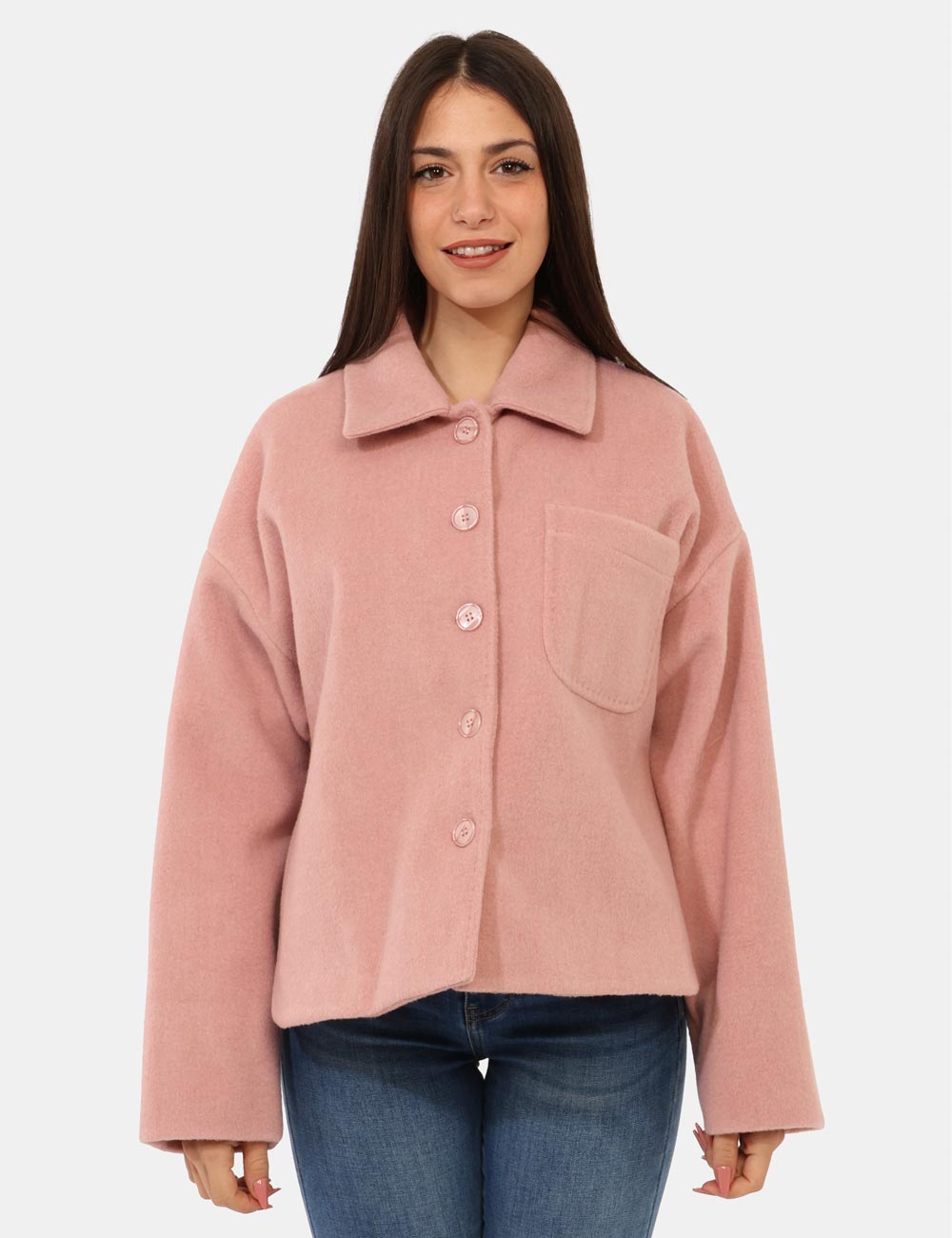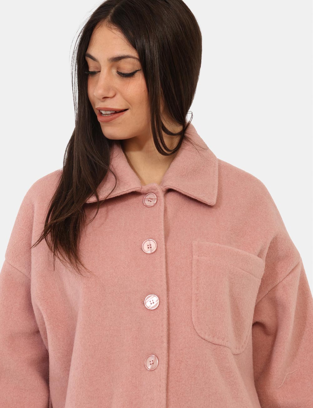 Cappottino corto in total rosa cipria con taschino a toppa. La vestibilità è morbida e pratica grazia a bottoni ad asola in tinta. Il cappotto è adatto per occasioni casual/raffinate e facillmente combinabile. Dona un tocco di colore ai tuoi outfit.